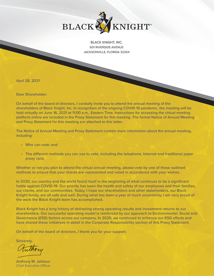 The enclosed proxy is solicited by the board of directors of Black Knight, Inc. for use at the Annual Meeting of Shareholders to be held on June 16, 2021 at 11:00 a.m., Eastern Time, or at any postponement or adjournment thereof, for the purposes set forth herein and in the accompanying Notice of Annual Meeting of Shareholders. The annual meeting will be held virtually at www.virtualshareholdermeeting.com/BKI2021.