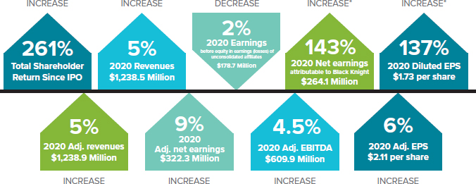 2020 was another solid year for Black Knight as we continued to execute against our long-term strategic objectives to drive growth through winning new clients, cross selling to existing clients, innovating with urgency and through acquisitions to further enhance our offerings. While we faced significant challenges related to the COVID-19 pandemic, we continued to focus on taking care of our employees and our clients, innovation, and executing against our strategic initiatives to drive long-term, sustainable growth and value for our clients and other stakeholders.