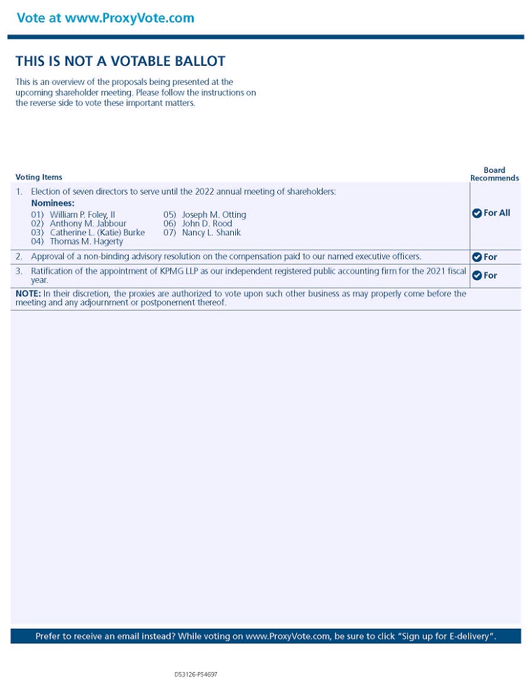 Vote at www.ProxyVote.comTHIS IS NOT A VOTABLE BALLOT This is an overview of the proposals being presented at the upcoming shareholder meeting. Please follow the instructions on the reverse side to vote these important matters.Voting Items 1. Election of seven directors to serve until the 2022 annual meeting of shareholders: Nominees:Board Recommends01) William P. Foley, II 02) Anthony M. Jabbour 03) Catherine L. (Katie) Burke 04) Thomas M. Hagerty05) Joseph M. Otting 06) John D. Rood 07) Nancy L. ShanikFor All2. Approval of a non-binding advisory resolution on the compensation paid to our named executive officers. 3. Ratification of the appointment of KPMG LLP as our independent registered public accounting firm for the 2021 fiscal year. NOTE: In their discretion, the proxies are authorized to vote upon such other business as may properly come before the meeting and any adjournment or postponement thereof.For ForPrefer to receive an email instead? While voting on www.ProxyVote.com, be sure to click “Sign up for E-delivery”.D53126-P54697