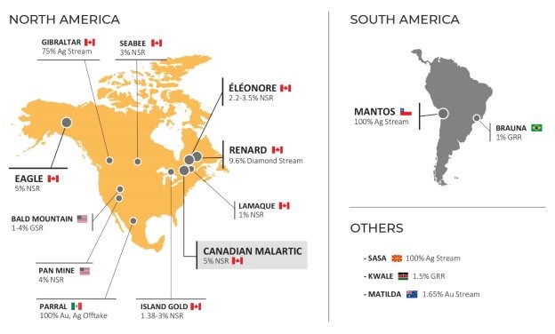 Osisko holds a 5% NSR royalty on East Gouldie, Odyssey South and the western half of East Malartic and a 3% NSR royalty on Odyssey North and the eastern half of East Malartic, which are located adjacent to the Canadian Malartic mine.