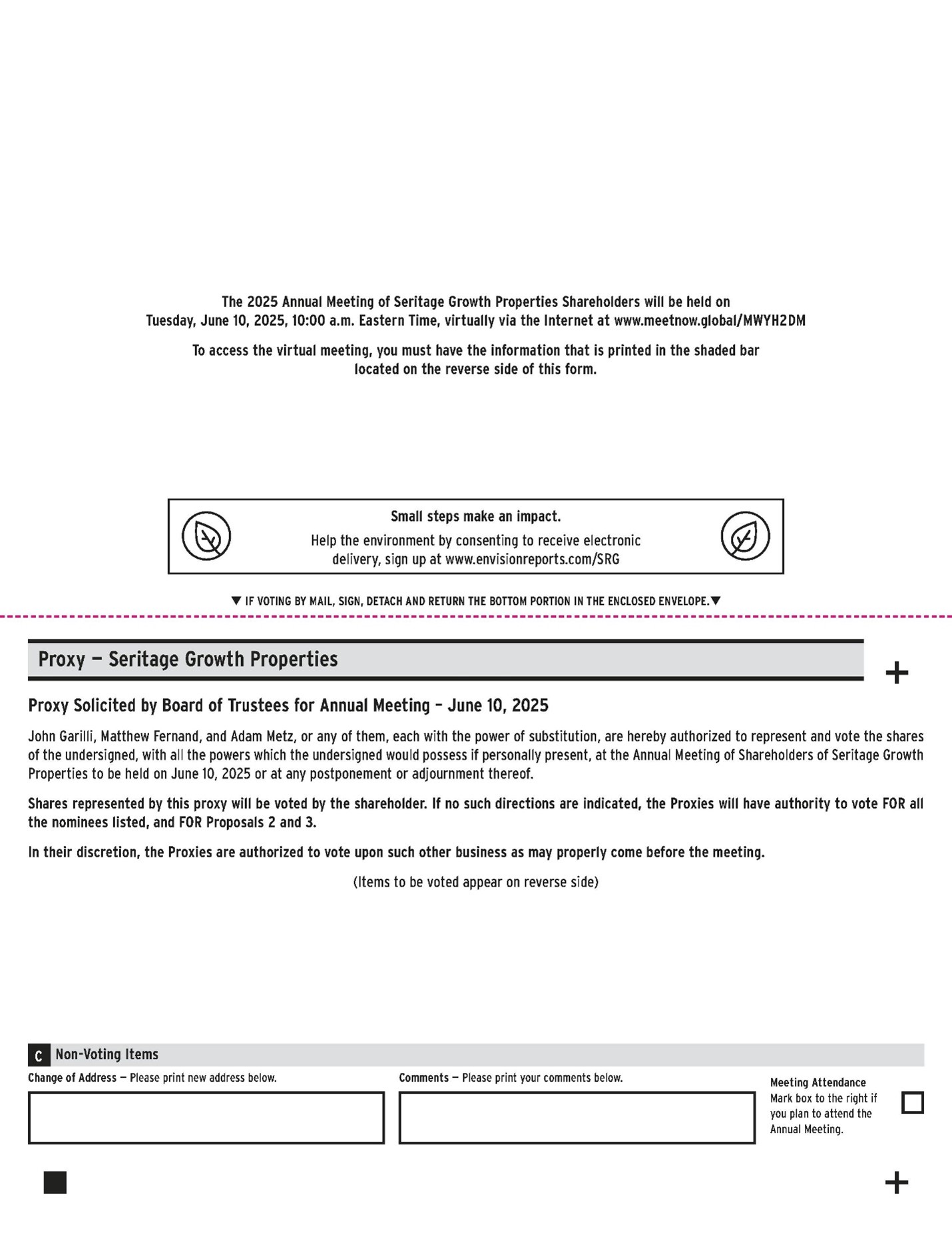 The trustees and officers of Seritage Growth Properties (“Seritage,” the “Company,” “our company,” “we,” “our” or “us”) are pleased to invite you to attend the 2025 annual meeting (the “Annual Meeting”) of the Company’s shareholders on June 10, 2025 at 10:00 a.m. (Eastern Time). This year’s Annual Meeting will be held in a virtual meeting format only. You will be able to attend the Annual Meeting virtually and vote and submit questions during the virtual Annual Meeting by visiting meetnow.global/MWYH2DM. For instructions on how to attend and vote your shares at the Annual Meeting, see the information in the accompanying Proxy Statement in the section titled “Questions and Answers - How do I attend and vote shares at the Annual Meeting?” Any reference herein to attending the Annual Meeting, including any reference to “in person” attendance, means attending by remote communication via live webcast on the Internet.