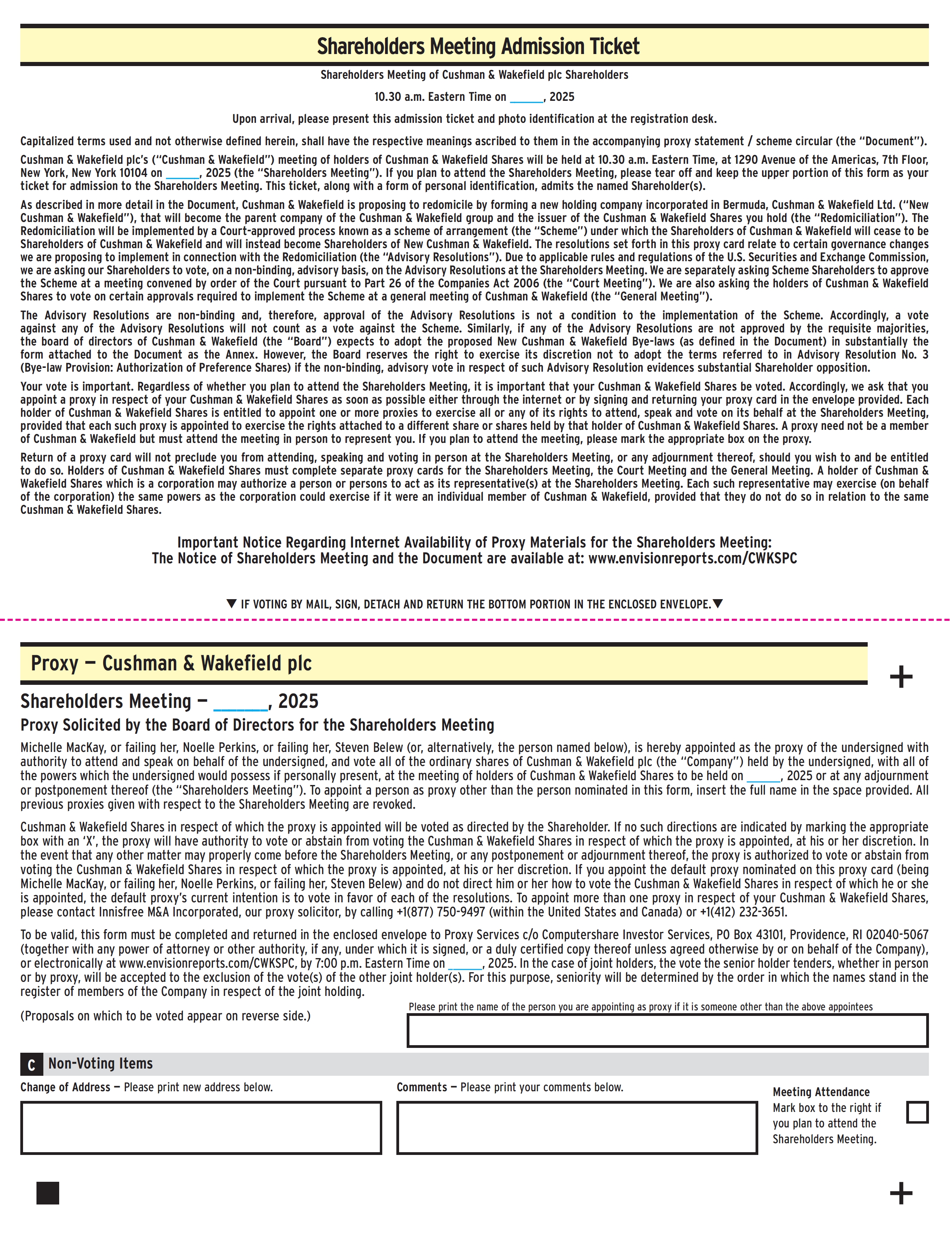 Since then, we have engaged extensively with Shareholders to further discuss these matters. We believe our revised proposals address the feedback we have received from Shareholders, while preserving the anticipated benefits of the Redomiciliation for Cushman & Wakefield and Shareholders. As requested by Shareholders, we are also providing Shareholders with certain additional information on the Redomiciliation, including the anticipated benefits of the Redomiciliation and alternatives considered by the Board.