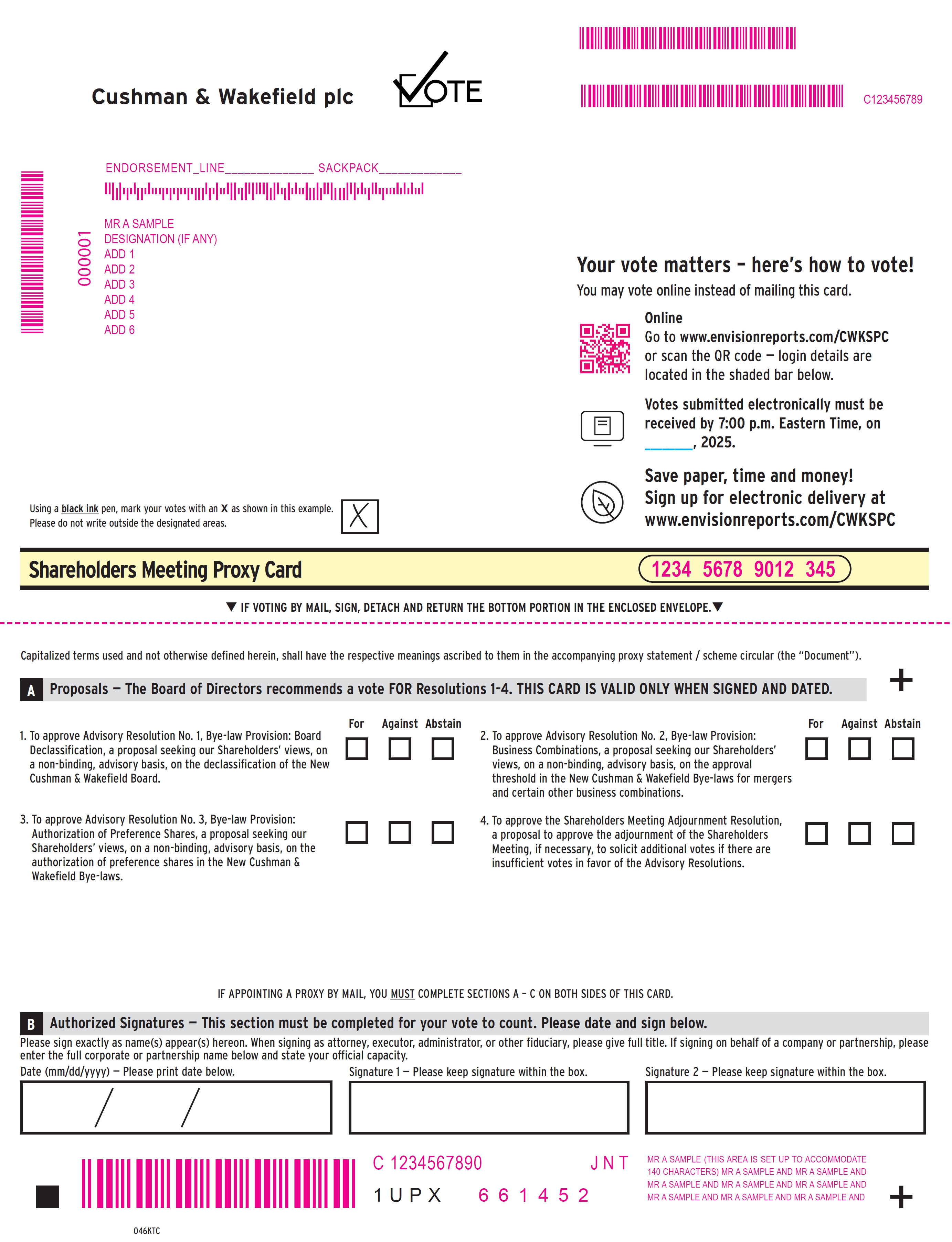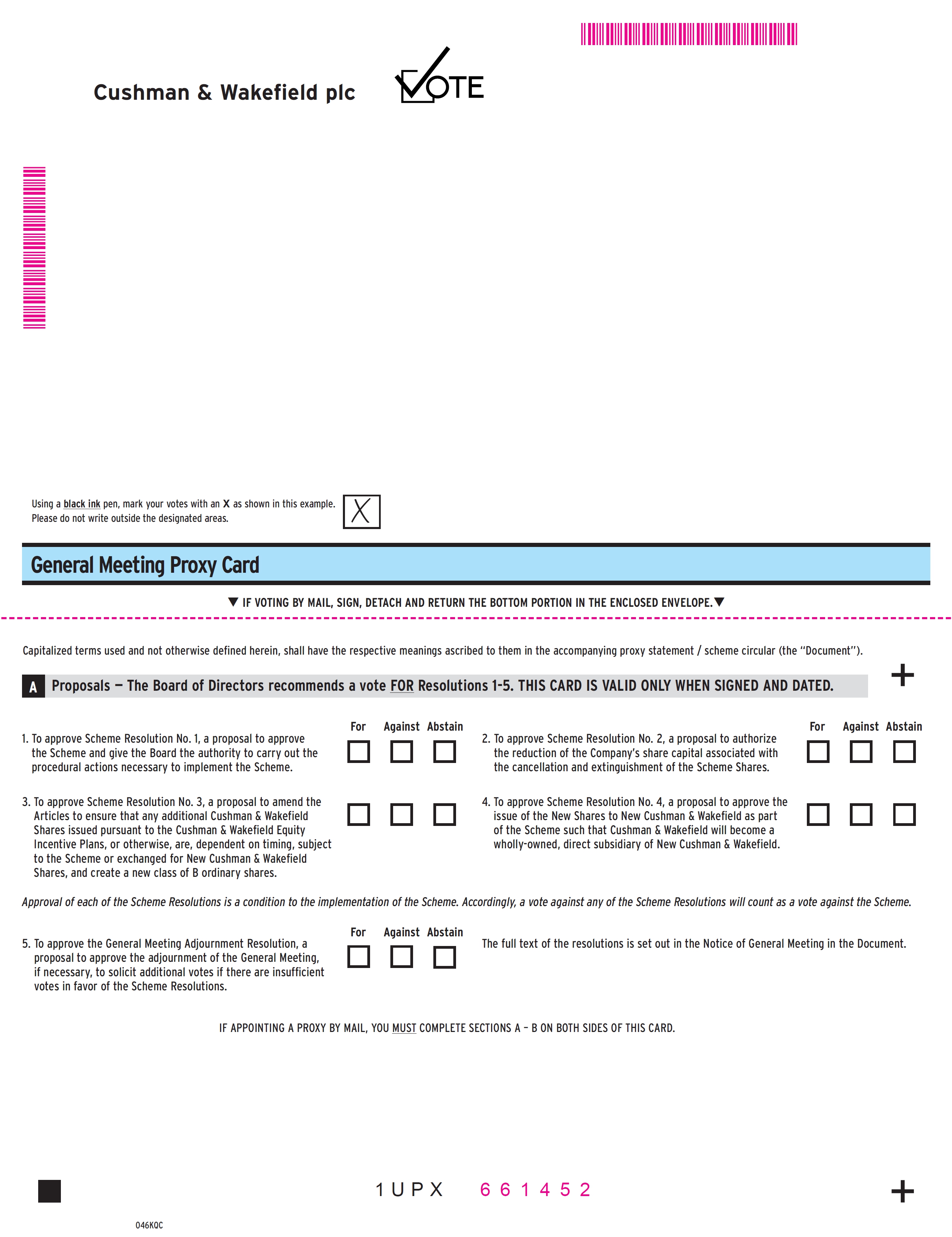 Please take a look at the letter from our Executive Vice President, Chief Legal Officer & Secretary beginning on the following page for the recommendations of the board of directors of Cushman & Wakefield on how to vote your Cushman & Wakefield Shares in this transaction.