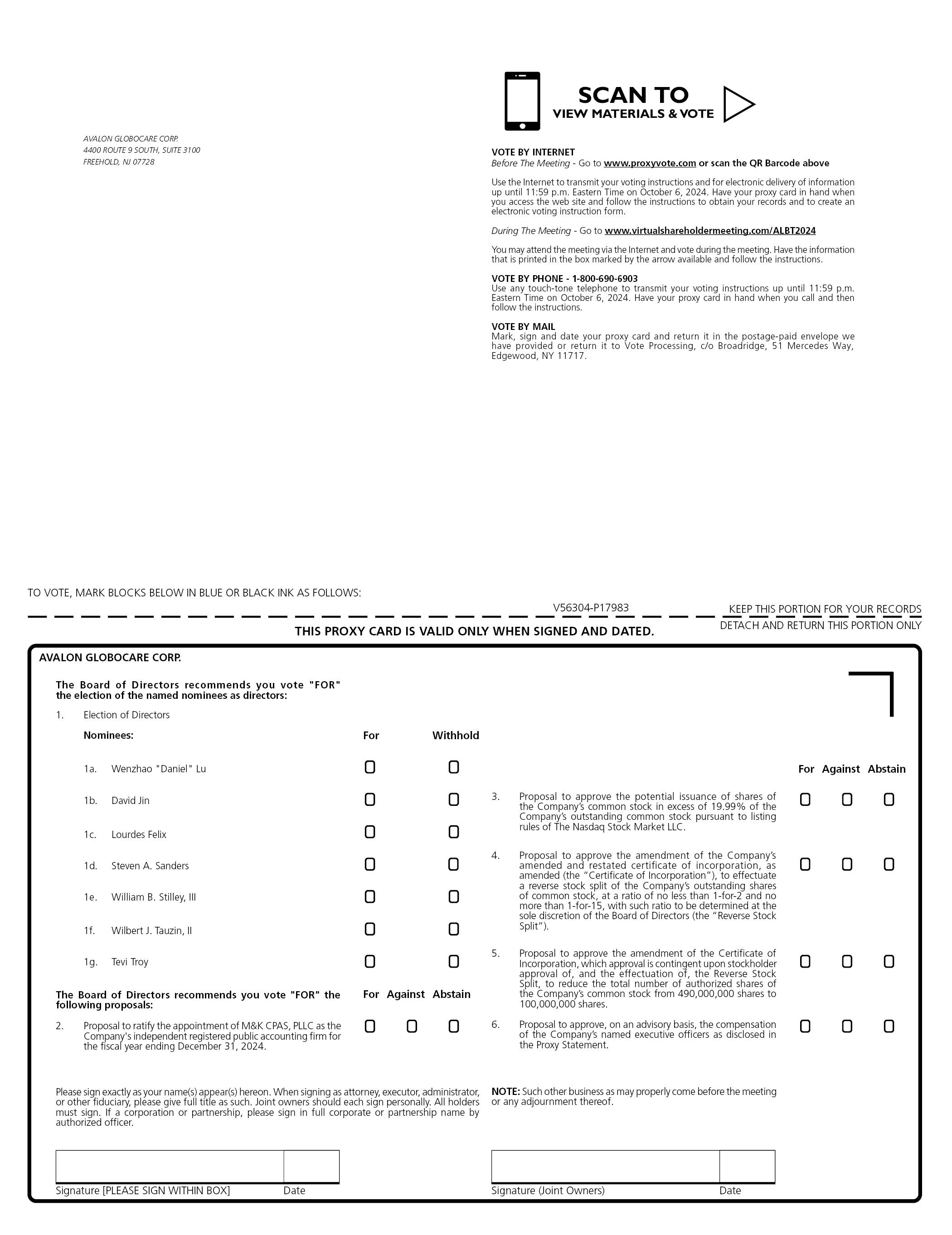 SCAN TO VIEW MATERIALS & VOTE AVALON GLOBOCARE CORP. 4400 ROUTE 9 SOUTH, SUITE 3100 FREEHOLD, NJ 07728 VOTE BY INTERNET Before The Meeting - Go to www.proxyvote.com or scan the QR Barcode above Use the Internet to transmit your voting instructions and for electronic delivery of information up until 11:59 p.m. Eastern Time on October 6, 2024. Have your proxy card in hand when you access the web site and follow the instructions to obtain your records and to create an electronic voting instruction form. During The Meeting - Go to www.virtualshareholdermeeting.com/ALBT2024 You may attend the meeting via the Internet and vote during the meeting. Have the information that is printed in the box marked by the arrow available and follow the instructions. VOTE BY PHONE - 1-800-690-6903 Use any touch-tone telephone to transmit your voting instructions up until 11:59 p.m. Eastern Time on October 6, 2024. Have your proxy card in hand when you call and then follow the instructions. VOTE BY MAIL Mark, sign and date your proxy card and return it in the postage-paid envelope we have provided or return it to Vote Processing, c/o Broadridge, 51 Mercedes Way, Edgewood, NY 11717. TO VOTE, MARK BLOCKS BELOW IN BLUE OR BLACK INK AS FOLLOWS: V56304-P17983 KEEP THIS PORTION FOR YOUR RECORDS AVALON GLOBOCARE CORP. THIS PROXY CARD IS VALID ONLY WHEN SIGNED AND DATED. DETACH AND RETURN THIS PORTION ONLY The Board of Directors recommends you vote “FOR” the election of the named nominees as directors: 1. Election of Directors Nominees: For Withhold For Against Abstain 3. 1a. Wenzhao “Daniel” Lu 1b. David Jin 1c. Lourdes Felix 1d. Steven A. Sanders 1e. William B. Stilley, III 1f. Wilbert J. Tauzin, II 1g. Tevi Troy 3. Proposal to approve the potential issuance of shares of the Company’s common stock in excess of 19.99% of the Company’s outstanding common stock pursuant to listing rules of The Nasdaq Stock Market LLC. The Board of Directors recommends you vote “FOR” the following proposals: For Against Abstain 4. Proposal to approve the amendment of the Company’s amended and restated certificate of incorporation, as amended (the “Certificate of Incorporation”), to effectuate a reverse stock split of the Company’s outstanding shares of common stock, at a ratio of no less than 1-for-2 and no more than 1-for-15, with such ratio to be determined at the sole discretion of the Board of Directors (the “Reverse Stock Split”). 5. 3. Proposal to approve the amendment of the Certificate of Incorporation, which approval is contingent upon stockholder approval of, and the effectuation of, the Reverse Stock Split, to reduce the total number of authorized shares of the Company’s common stock from 490,000,000 shares to 100,000,000 shares. 3. 2. 1. Proposal to ratify the appointment of M&K CPAS, PLLC as the Company’s independent registered public accounting firm for the fiscal year ending December 31, 2024. Please sign exactly as your name(s) appear(s) hereon. When signing as attorney, executor, administrator, or other fiduciary, please give full title as such. Joint owners should each sign personally. All holders must sign. If a corporation or partnership, please sign in full corporate or partnership name by authorized officer. 6. Proposal to approve, on an advisory basis, the compensation of the Company’s named executive officers as disclosed in the Proxy Statement. NOTE: Such other business as may properly come before the meeting or any adjournment thereof. Signature [PLEASE SIGN WITHIN BOX] Date Signature (Joint Owners) Date