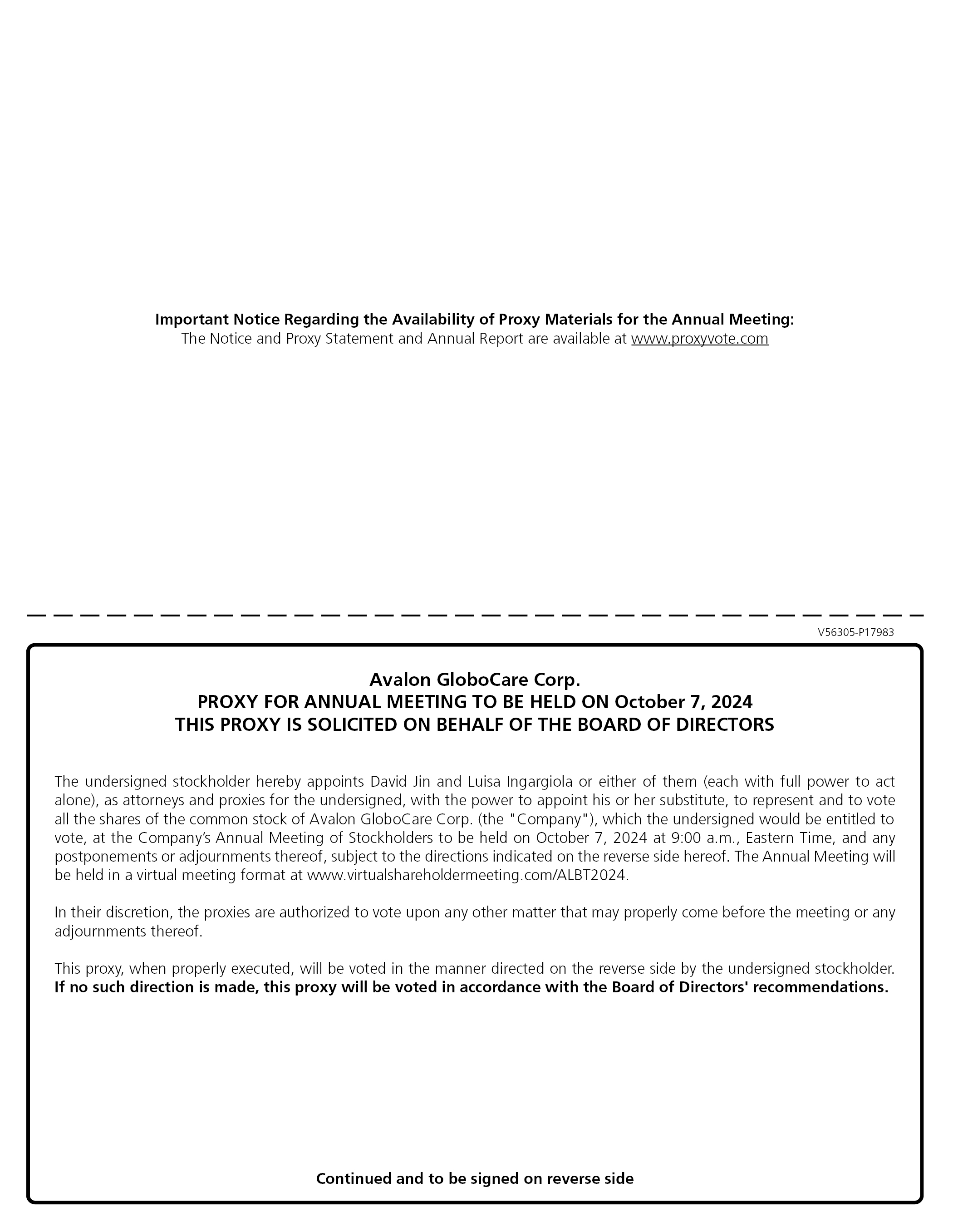 Important Notice Regarding the Availability of Proxy Materials for the Annual Meeting: The Notice and Proxy Statement and Annual Report are available at www.proxyvote.com V56305-P17983 Avalon GloboCare Corp. PROXY FOR ANNUAL MEETING TO BE HELD ON October 7, 2024 THIS PROXY IS SOLICITED ON BEHALF OF THE BOARD OF DIRECTORS The undersigned stockholder hereby appoints David Jin and Luisa Ingargiola or either of them (each with full power to act alone), as attorneys and proxies for the undersigned, with the power to appoint his or her substitute, to represent and to vote all the shares of the common stock of Avalon GloboCare Corp. (the “Company”), which the undersigned would be entitled to vote, at the Company’s Annual Meeting of Stockholders to be held on October 7, 2024 at 9:00 a.m., Eastern Time, and any postponements or adjournments thereof, subject to the directions indicated on the reverse side hereof. The Annual Meeting will be held in a virtual meeting format at www.virtualshareholdermeeting.com/ALBT2024. In their discretion, the proxies are authorized to vote upon any other matter that may properly come before the meeting or any adjournments thereof. This proxy, when properly executed, will be voted in the manner directed on the reverse side by the undersigned stockholder. If no such direction is made, this proxy will be voted in accordance with the Board of Directors’ recommendations. Continued and to be signed on reverse side