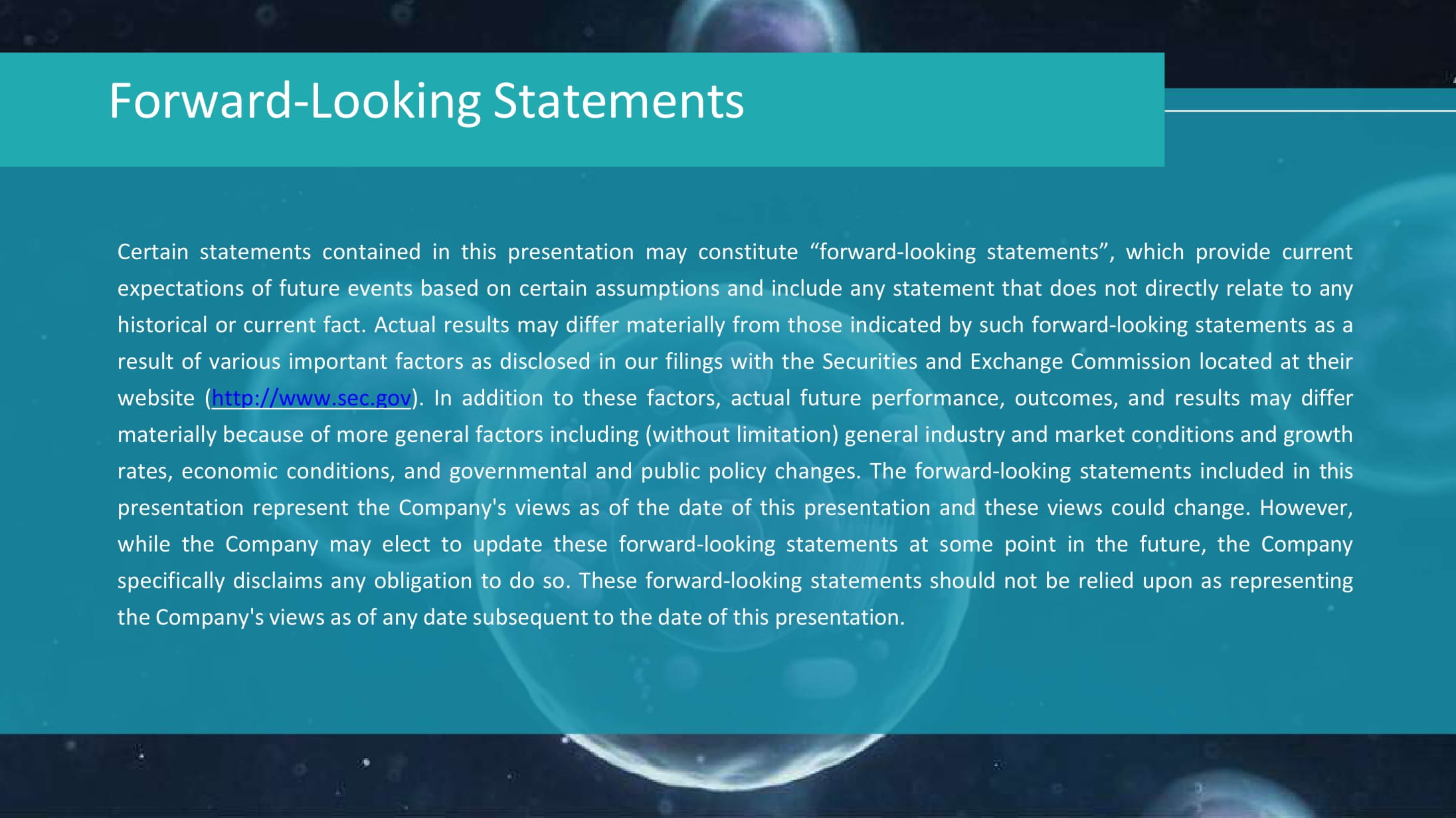 Forward - Looking Statements 2 2 Certain statements contained in this presentation may constitute “forward - looking statements”, which provide current expectations of future events based on certain assumptions and include any statement that does not directly relate to any historical or current fact . Actual results may differ materially from those indicated by such forward - looking statements as a result of various important factors as disclosed in our filings with the Securities and Exchange Commission located at their website ( http : //www . sec . gov ) . In addition to these factors, actual future performance, outcomes, and results may differ materially because of more general factors including (without limitation) general industry and market conditions and growth rates, economic conditions, and governmental and public policy changes . The forward - looking statements included in this presentation represent the Company's views as of the date of this presentation and these views could change . However, while the Company may elect to update these forward - looking statements at some point in the future, the Company specifically disclaims any obligation to do so . These forward - looking statements should not be relied upon as representing the Company's views as of any date subsequent to the date of this presentation . Forward - Looking Statements