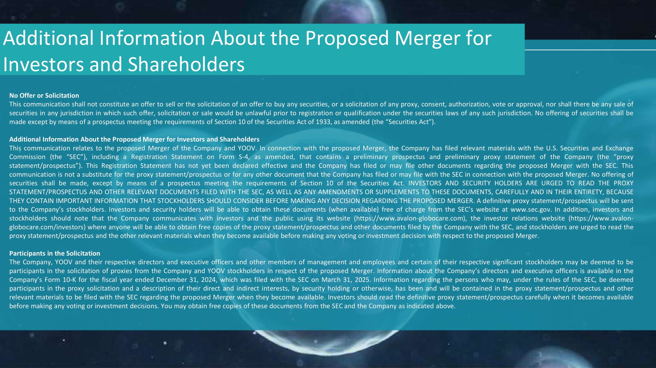 Forward - Looking Statements 2 2 No Offer or Solicitation This communication shall not constitute an offer to sell or the solicitation of an offer to buy any securities, or a solicitation of any proxy, consent, authorization, vote or approval, nor shall there be any sale of securities in any jurisdiction in which such offer, solicitation or sale would be unlawful prior to registration or qualification under the securities laws of any such jurisdiction . No offering of securities shall be made except by means of a prospectus meeting the requirements of Section 10 of the Securities Act of 1933 , as amended (the “Securities Act”) . Additional Information About the Proposed Merger for Investors and Shareholders This communication relates to the proposed Merger of the Company and YOOV . In connection with the proposed Merger, the Company has filed relevant materials with the U . S . Securities and Exchange Commission (the “SEC”), including a Registration Statement on Form S - 4 , as amended, that contains a preliminary prospectus and preliminary proxy statement of the Company (the “proxy statement/prospectus”) . This Registration Statement has not yet been declared effective and the Company has filed or may file other documents regarding the proposed Merger with the SEC . This communication is not a substitute for the proxy statement/prospectus or for any other document that the Company has filed or may file with the SEC in connection with the proposed Merger . No offering of securities shall be made, except by means of a prospectus meeting the requirements of Section 10 of the Securities Act . INVESTORS AND SECURITY HOLDERS ARE URGED TO READ THE PROXY STATEMENT/PROSPECTUS AND OTHER RELEVANT DOCUMENTS FILED WITH THE SEC, AS WELL AS ANY AMENDMENTS OR SUPPLEMENTS TO THESE DOCUMENTS, CAREFULLY AND IN THEIR ENTIRETY, BECAUSE THEY CONTAIN IMPORTANT INFORMATION THAT STOCKHOLDERS SHOULD CONSIDER BEFORE MAKING ANY DECISION REGARDING THE PROPOSED MERGER . A definitive proxy statement/prospectus will be sent to the Company’s stockholders . Investors and security holders will be able to obtain these documents (when available) free of charge from the SEC’s website at www . sec . gov . In addition, investors and stockholders should note that the Company communicates with investors and the public using its website (https : //www . avalon - globocare . com), the investor relations website (https : //www . avalon - globocare . com/investors) where anyone will be able to obtain free copies of the proxy statement/prospectus and other documents filed by the Company with the SEC, and stockholders are urged to read the proxy statement/prospectus and the other relevant materials when they become available before making any voting or investment decision with respect to the proposed Merger . Participants in the Solicitation The Company, YOOV and their respective directors and executive officers and other members of management and employees and certain of their respective significant stockholders may be deemed to be participants in the solicitation of proxies from the Company and YOOV stockholders in respect of the proposed Merger . Information about the Company’s directors and executive officers is available in the Company’s Form 10 - K for the fiscal year ended December 31 , 2024 , which was filed with the SEC on March 31 , 2025 . Information regarding the persons who may, under the rules of the SEC, be deemed participants in the proxy solicitation and a description of their direct and indirect interests, by security holding or otherwise, has been and will be contained in the proxy statement/prospectus and other relevant materials to be filed with the SEC regarding the proposed Merger when they become available . Investors should read the definitive proxy statement/prospectus carefully when it becomes available before making any voting or investment decisions . You may obtain free copies of these documents from the SEC and the Company as indicated above . Additional Information About the Proposed Merger for Investors and Shareholders
