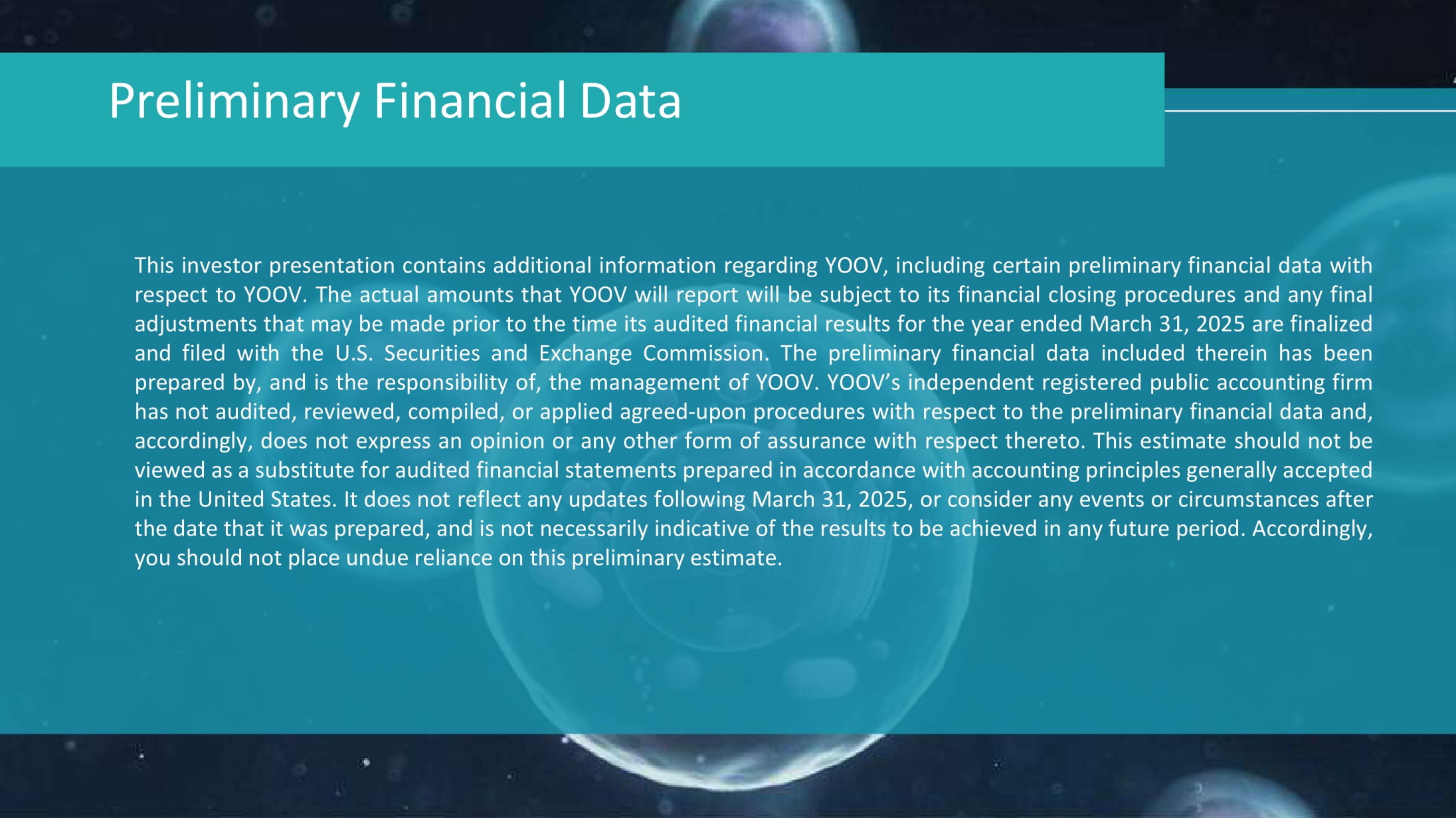 Forward - Looking Statements 2 2 This investor presentation contains additional information regarding YOOV , including certain preliminary financial data with respect to YOOV . The actual amounts that YOOV will report will be subject to its financial closing procedures and any final adjustments that may be made prior to the time its audited financial results for the year ended March 31 , 2025 are finalized and filed with the U . S . Securities and Exchange Commission . The preliminary financial data included therein has been prepared by, and is the responsibility of, the management of YOOV . YOOV’s independent registered public accounting firm has not audited, reviewed, compiled, or applied agreed - upon procedures with respect to the preliminary financial data and, accordingly, does not express an opinion or any other form of assurance with respect thereto . This estimate should not be viewed as a substitute for audited financial statements prepared in accordance with accounting principles generally accepted in the United States . It does not reflect any updates following March 31 , 2025 , or consider any events or circumstances after the date that it was prepared, and is not necessarily indicative of the results to be achieved in any future period . Accordingly, you should not place undue reliance on this preliminary estimate . Preliminary Financial Data