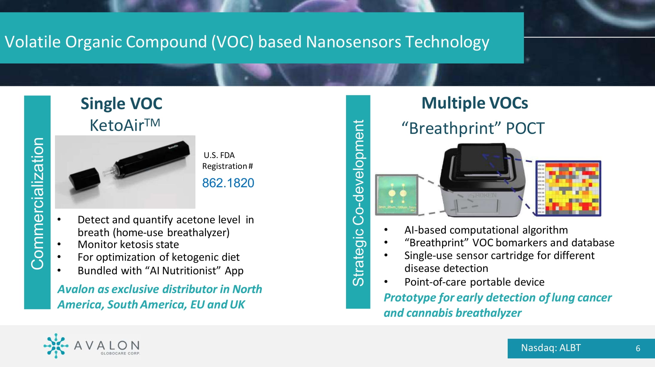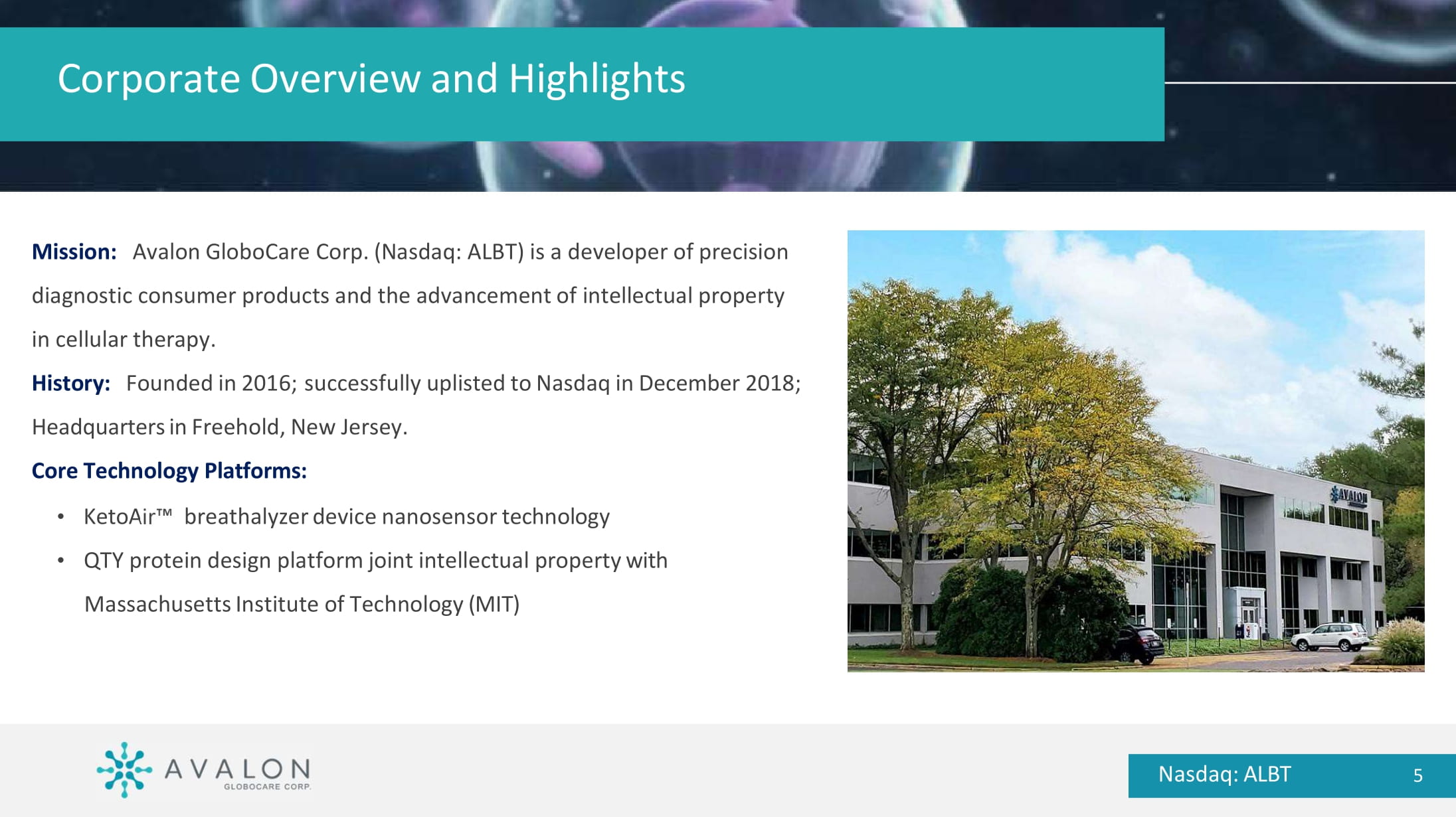 Mission: Avalon GloboCare Corp. (Nasdaq: ALBT) is a developer of precision diagnostic consumer products and the advancement of intellectual property in cellular therapy. History: Founded in 2016; successfully uplisted to Nasdaq in December 2018; Headquarters in Freehold, New Jersey . Core Technology Platforms: • KetoAir breathalyzer device nanosensor technology • QTY protein design platform joint intellectual property with Massachusetts Institute of Technology (MIT) Corporate Overview and Highlights Nasdaq: ALBT 5