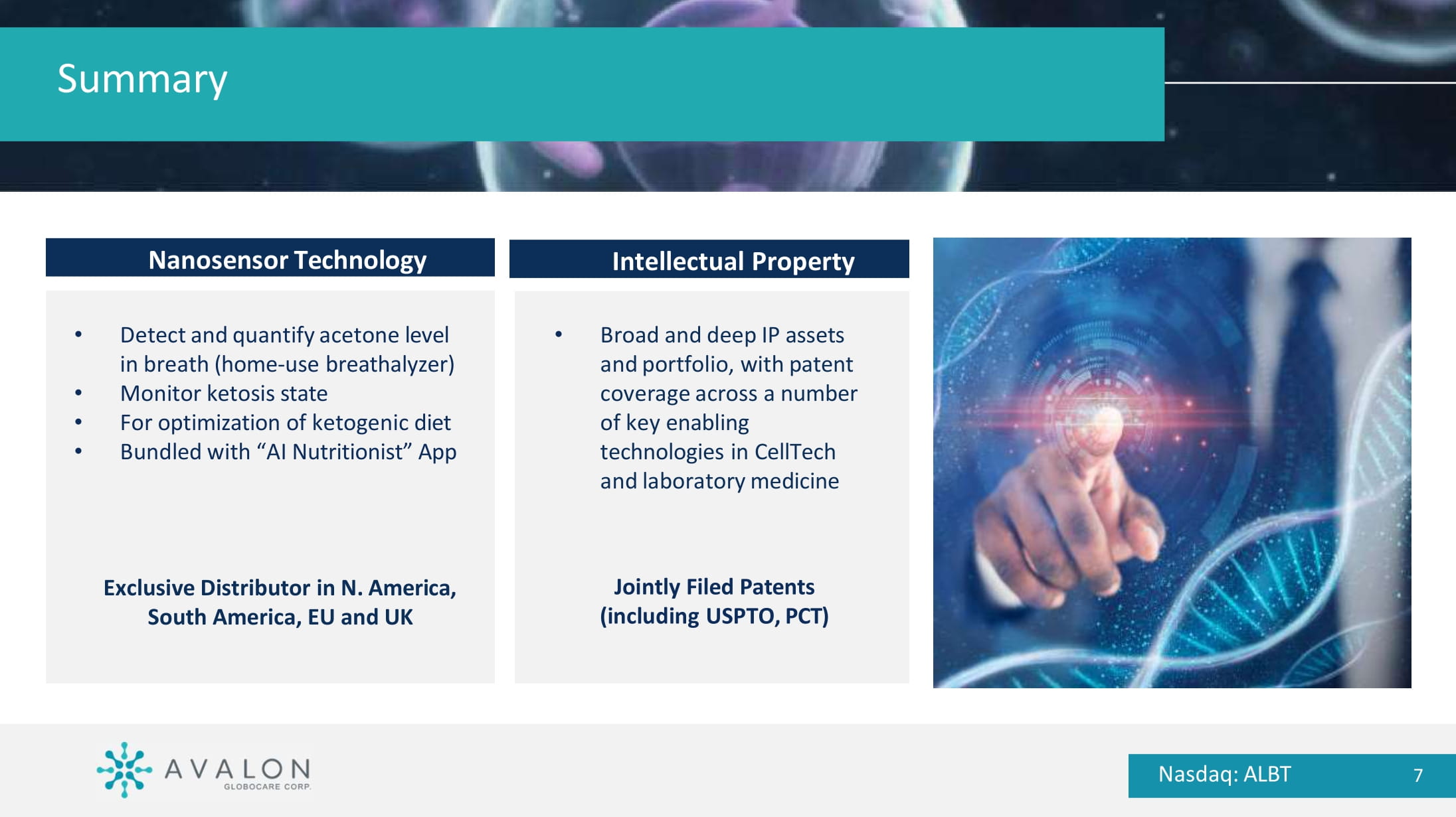 Summary Nanosensor Technology Nasdaq: ALBT 7 Jointly Filed Patents (including USPTO, PCT) • Detect and quantify acetone level in breath (home - use breathalyzer) • Monitor ketosis state • For optimization of ketogenic diet • Bundled with “AI Nutritionist” App Exclusive Distributor in N. America, South America, EU and UK • Broad and deep IP assets and portfolio, with patent coverage across a number of key enabling technologies in CellTech and laboratory medicine Intellectual Property