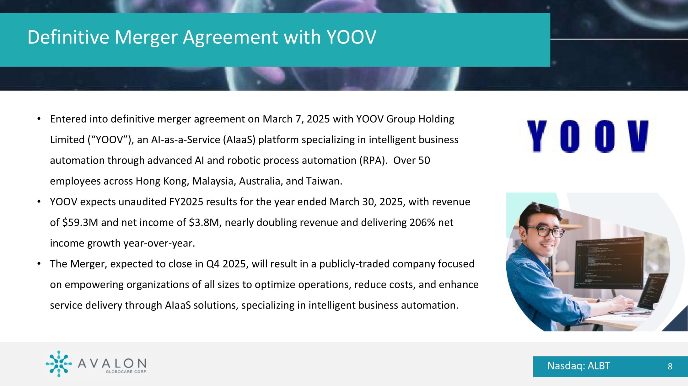 • Entered into definitive merger agreement on March 7, 2025 with YOOV Group Holding Limited (“YOOV”), an AI - as - a - Service ( AIaaS ) platform specializing in intelligent business automation through advanced AI and robotic process automation (RPA). Over 50 employees across Hong Kong, Malaysia, Australia, and Taiwan. • YOOV expects unaudited FY2025 results for the year ended March 30, 2025, with revenue of $59.3M and net income of $3.8M, nearly doubling revenue and delivering 206% net income growth year - over - year. • The Merger, expected to close in Q4 2025, will result in a publicly - traded company focused on empowering organizations of all sizes to optimize operations, reduce costs, and enhance service delivery through AIaaS solutions, specializing in intelligent business automation. Definitive Merger Agreement with YOOV Nasdaq: ALBT 8