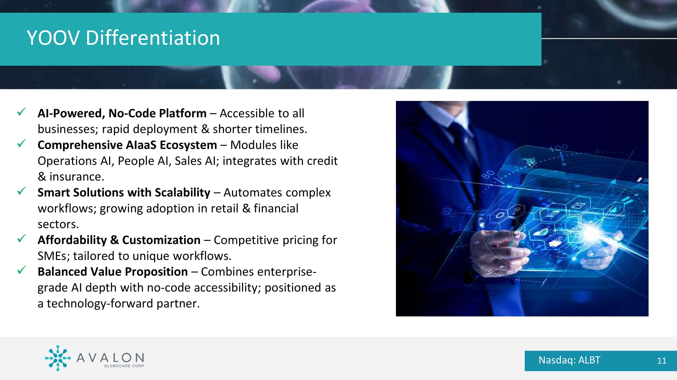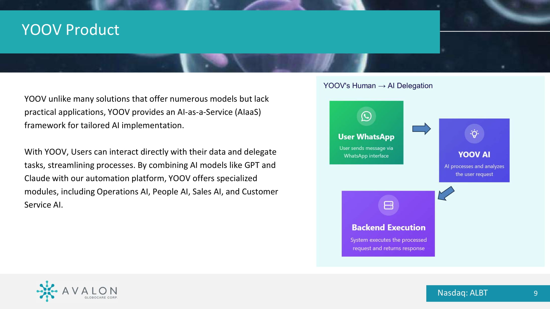 YOOV Product Nasdaq: ALBT 9 YOOV unlike many solutions that offer numerous models but lack practical applications, YOOV provides an AI - as - a - Service ( AIaaS ) framework for tailored AI implementation. With YOOV, Users can interact directly with their data and delegate tasks, streamlining processes. By combining AI models like GPT and Claude with our automation platform, YOOV offers specialized modules, including Operations AI, People AI, Sales AI, and Customer Service AI.