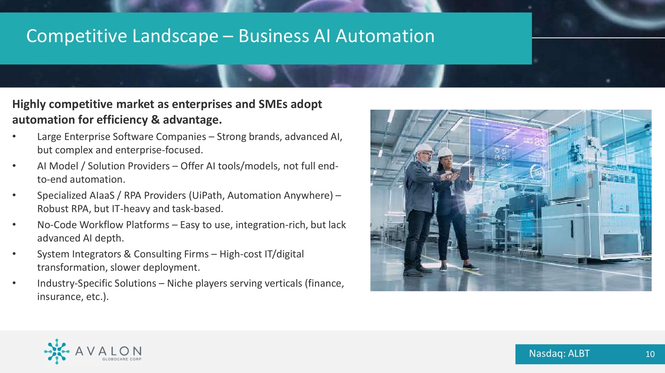 Competitive Landscape – Business AI Automation Nasdaq: ALBT 10 Highly competitive market as enterprises and SMEs adopt automation for efficiency & advantage. • Large Enterprise Software Companies – Strong brands, advanced AI, but complex and enterprise - focused. • AI Model / Solution Providers – Offer AI tools/models, not full end - to - end automation. • Specialized AIaaS / RPA Providers (UiPath, Automation Anywhere) – Robust RPA, but IT - heavy and task - based. • No - Code Workflow Platforms – Easy to use, integration - rich, but lack advanced AI depth. • System Integrators & Consulting Firms – High - cost IT/digital transformation, slower deployment. • Industry - Specific Solutions – Niche players serving verticals (finance, insurance, etc.).