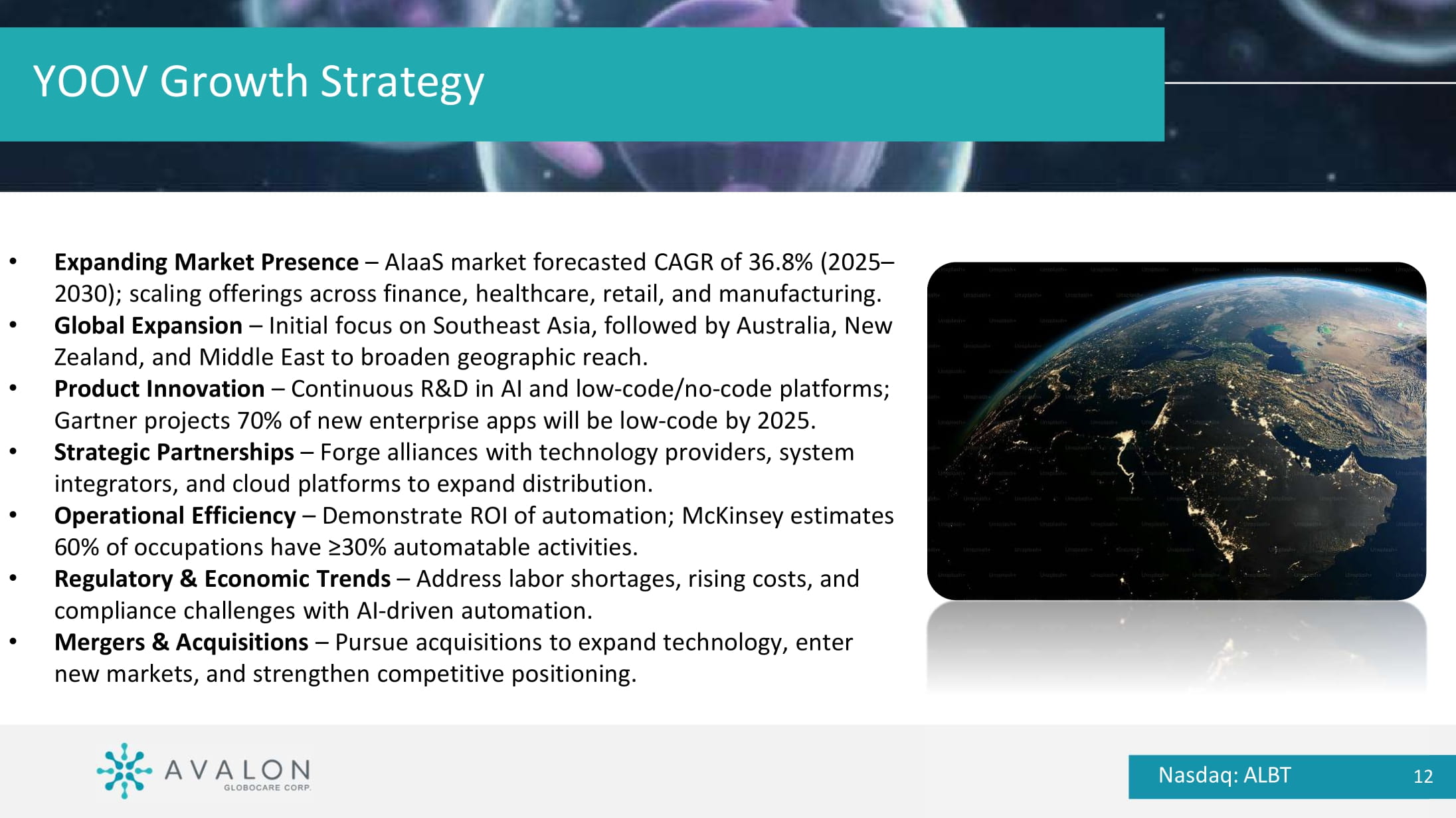 YOOV Growth Strategy • Expanding Market Presence – AIaaS market forecasted CAGR of 36.8% (2025 – 2030); scaling offerings across finance, healthcare, retail, and manufacturing. • Global Expansion – Initial focus on Southeast Asia, followed by Australia, New Zealand, and Middle East to broaden geographic reach. • Product Innovation – Continuous R&D in AI and low - code/no - code platforms; Gartner projects 70% of new enterprise apps will be low - code by 2025. • Strategic Partnerships – Forge alliances with technology providers, system integrators, and cloud platforms to expand distribution. • Operational Efficiency – Demonstrate ROI of automation; McKinsey estimates 60% of occupations have ≥30% automatable activities. • Regulatory & Economic Trends – Address labor shortages, rising costs, and compliance challenges with AI - driven automation. • Mergers & Acquisitions – Pursue acquisitions to expand technology, enter new markets, and strengthen competitive positioning. Nasdaq: ALBT 12