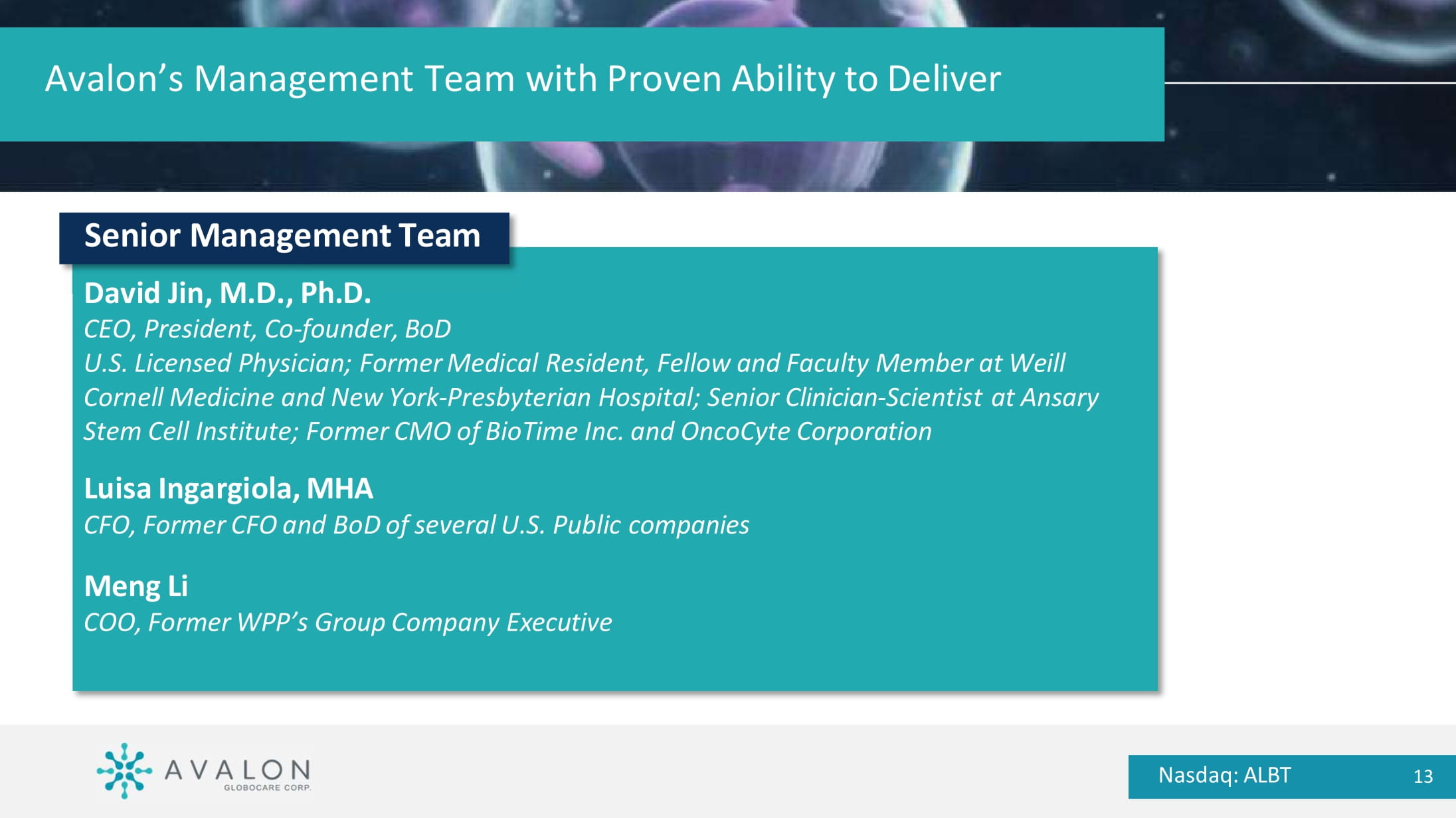 Senior Management Team David Jin, M.D., Ph.D. CEO, President, Co - founder, BoD U.S. Licensed Physician; Former Medical Resident, Fellow and Faculty Member at Weill Cornell Medicine and New York - Presbyterian Hospital; Senior Clinician - Scientist at Ansary Stem Cell Institute; Former CMO of BioTime Inc. and OncoCyte Corporation Luisa Ingargiola, MHA CFO, Former CFO and BoD of several U.S. Public companies Meng Li COO, Former WPP’s Group Company Executive Nasdaq: ALBT 13 Avalon’s Management Team with Proven Ability to Deliver