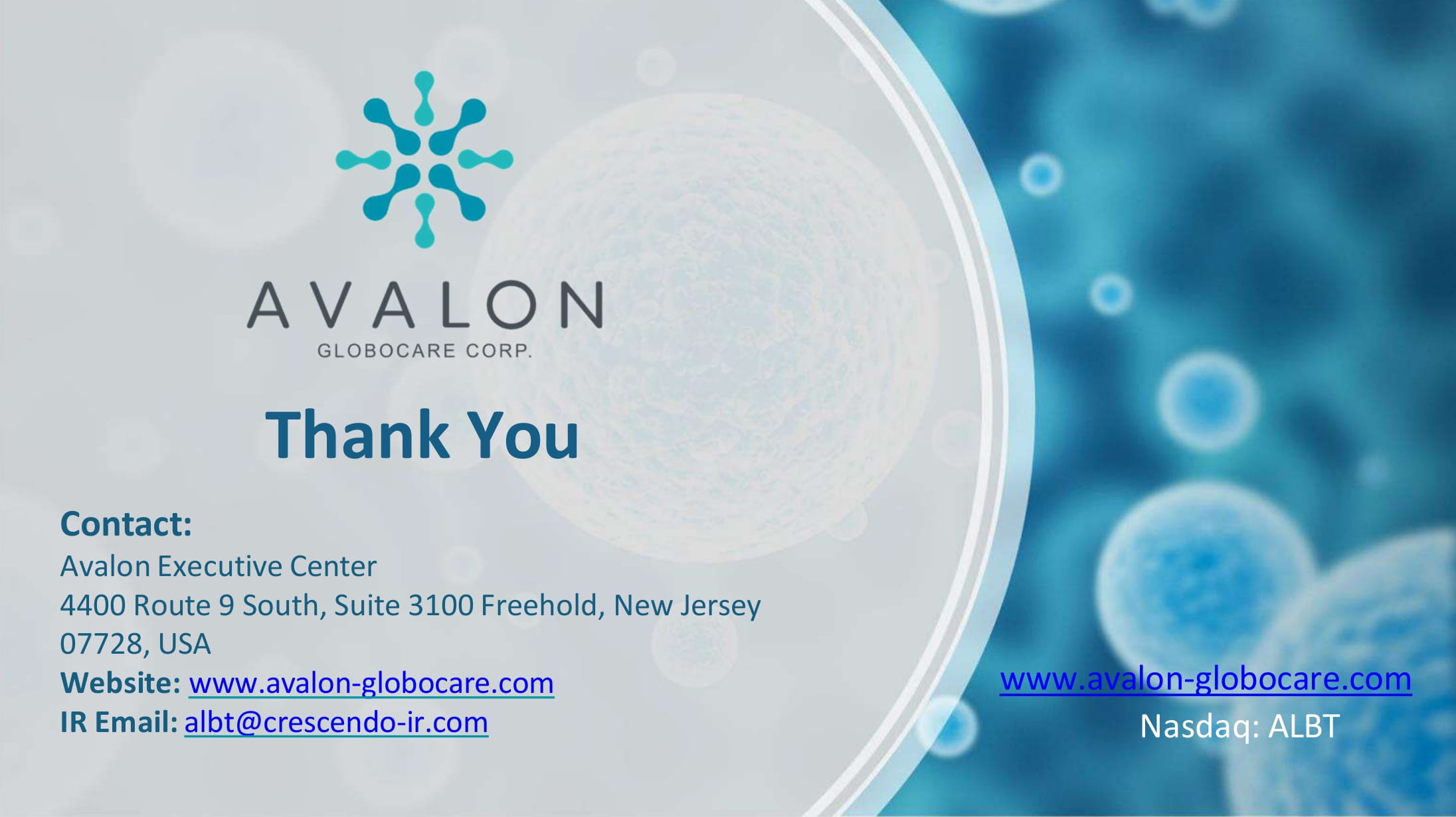 www.avalon - globocare.com Nasdaq: ALBT Contact: Avalon Executive Center 4400 Route 9 South, Suite 3100 Freehold, New Jersey 07728, USA Website: www.avalon - globocare.com IR Email: albt@crescendo - ir.com Thank You