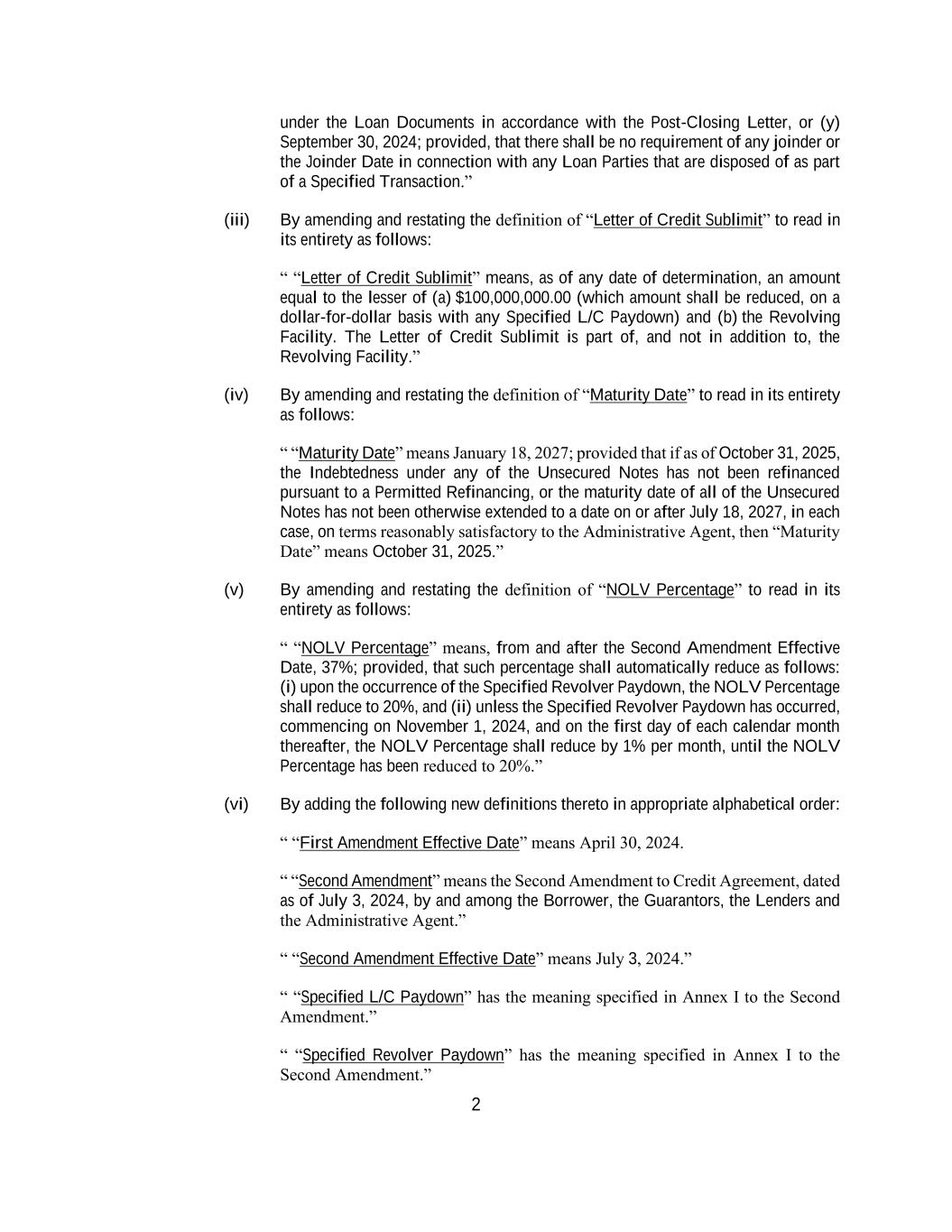 2 under the Loan Documents in accordance with the Post-Closing Letter, or (y) September 30, 2024; provided, that there shall be no requirement of any joinder or the Joinder Date in connection with any Loan Parties that are disposed of as part of a Specified Transaction.” (iii) By amending and restating the definition of “Letter of Credit Sublimit” to read in its entirety as follows: “ “Letter of Credit Sublimit” means, as of any date of determination, an amount equal to the lesser of (a) $100,000,000.00 (which amount shall be reduced, on a dollar-for-dollar basis with any Specified L/C Paydown) and (b) the Revolving Facility. The Letter of Credit Sublimit is part of, and not in addition to, the Revolving Facility.” (iv) By amending and restating the definition of “Maturity Date” to read in its entirety as follows: “ “Maturity Date” means January 18, 2027; provided that if as of October 31, 2025, the Indebtedness under any of the Unsecured Notes has not been refinanced pursuant to a Permitted Refinancing, or the maturity date of all of the Unsecured Notes has not been otherwise extended to a date on or after July 18, 2027, in each case, on terms reasonably satisfactory to the Administrative Agent, then “Maturity Date” means October 31, 2025.” (v) By amending and restating the definition of “NOLV Percentage” to read in its entirety as follows: “ “NOLV Percentage” means, from and after the Second Amendment Effective Date, 37%; provided, that such percentage shall automatically reduce as follows: (i) upon the occurrence of the Specified Revolver Paydown, the NOLV Percentage shall reduce to 20%, and (ii) unless the Specified Revolver Paydown has occurred, commencing on November 1, 2024, and on the first day of each calendar month thereafter, the NOLV Percentage shall reduce by 1% per month, until the NOLV Percentage has been reduced to 20%.” (vi) By adding the following new definitions thereto in appropriate alphabetical order: “ “First Amendment Effective Date” means April 30, 2024. “ “Second Amendment” means the Second Amendment to Credit Agreement, dated as of July 3, 2024, by and among the Borrower, the Guarantors, the Lenders and the Administrative Agent.” “ “Second Amendment Effective Date” means July 3, 2024.” “ “Specified L/C Paydown” has the meaning specified in Annex I to the Second Amendment.” “ “Specified Revolver Paydown” has the meaning specified in Annex I to the Second Amendment.”