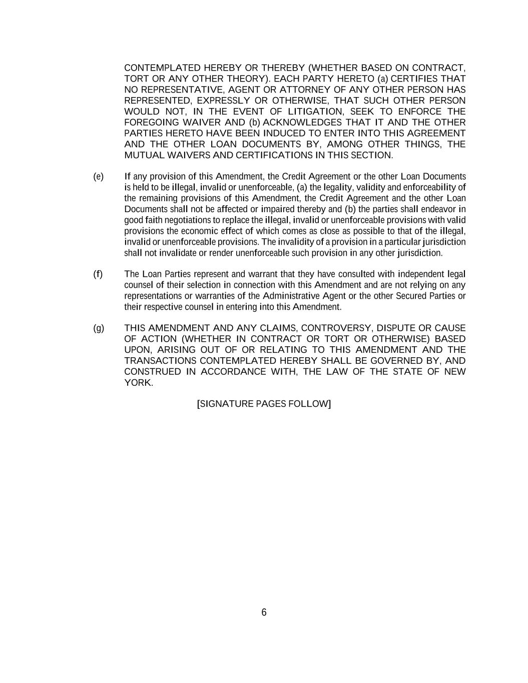 6 CONTEMPLATED HEREBY OR THEREBY (WHETHER BASED ON CONTRACT, TORT OR ANY OTHER THEORY). EACH PARTY HERETO (a) CERTIFIES THAT NO REPRESENTATIVE, AGENT OR ATTORNEY OF ANY OTHER PERSON HAS REPRESENTED, EXPRESSLY OR OTHERWISE, THAT SUCH OTHER PERSON WOULD NOT, IN THE EVENT OF LITIGATION, SEEK TO ENFORCE THE FOREGOING WAIVER AND (b) ACKNOWLEDGES THAT IT AND THE OTHER PARTIES HERETO HAVE BEEN INDUCED TO ENTER INTO THIS AGREEMENT AND THE OTHER LOAN DOCUMENTS BY, AMONG OTHER THINGS, THE MUTUAL WAIVERS AND CERTIFICATIONS IN THIS SECTION. (e) If any provision of this Amendment, the Credit Agreement or the other Loan Documents is held to be illegal, invalid or unenforceable, (a) the legality, validity and enforceability of the remaining provisions of this Amendment, the Credit Agreement and the other Loan Documents shall not be affected or impaired thereby and (b) the parties shall endeavor in good faith negotiations to replace the illegal, invalid or unenforceable provisions with valid provisions the economic effect of which comes as close as possible to that of the illegal, invalid or unenforceable provisions. The invalidity of a provision in a particular jurisdiction shall not invalidate or render unenforceable such provision in any other jurisdiction. (f) The Loan Parties represent and warrant that they have consulted with independent legal counsel of their selection in connection with this Amendment and are not relying on any representations or warranties of the Administrative Agent or the other Secured Parties or their respective counsel in entering into this Amendment. (g) THIS AMENDMENT AND ANY CLAIMS, CONTROVERSY, DISPUTE OR CAUSE OF ACTION (WHETHER IN CONTRACT OR TORT OR OTHERWISE) BASED UPON, ARISING OUT OF OR RELATING TO THIS AMENDMENT AND THE TRANSACTIONS CONTEMPLATED HEREBY SHALL BE GOVERNED BY, AND CONSTRUED IN ACCORDANCE WITH, THE LAW OF THE STATE OF NEW YORK. [SIGNATURE PAGES FOLLOW]