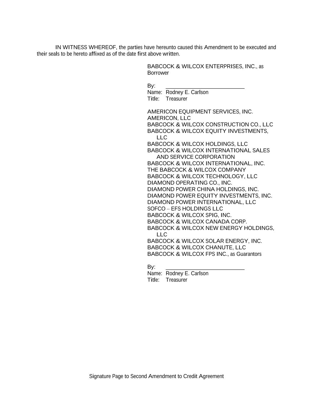 Signature Page to Second Amendment to Credit Agreement IN WITNESS WHEREOF, the parties have hereunto caused this Amendment to be executed and their seals to be hereto affixed as of the date first above written. BABCOCK & WILCOX ENTERPRISES, INC., as Borrower By: ____________________________ Name: Rodney E. Carlson Title: Treasurer AMERICON EQUIPMENT SERVICES, INC. AMERICON, LLC BABCOCK & WILCOX CONSTRUCTION CO., LLC BABCOCK & WILCOX EQUITY INVESTMENTS, LLC BABCOCK & WILCOX HOLDINGS, LLC BABCOCK & WILCOX INTERNATIONAL SALES AND SERVICE CORPORATION BABCOCK & WILCOX INTERNATIONAL, INC. THE BABCOCK & WILCOX COMPANY BABCOCK & WILCOX TECHNOLOGY, LLC DIAMOND OPERATING CO., INC. DIAMOND POWER CHINA HOLDINGS, INC. DIAMOND POWER EQUITY INVESTMENTS, INC. DIAMOND POWER INTERNATIONAL, LLC SOFCO – EFS HOLDINGS LLC BABCOCK & WILCOX SPIG, INC. BABCOCK & WILCOX CANADA CORP. BABCOCK & WILCOX NEW ENERGY HOLDINGS, LLC BABCOCK & WILCOX SOLAR ENERGY, INC. BABCOCK & WILCOX CHANUTE, LLC BABCOCK & WILCOX FPS INC., as Guarantors By: ____________________________ Name: Rodney E. Carlson Title: Treasurer