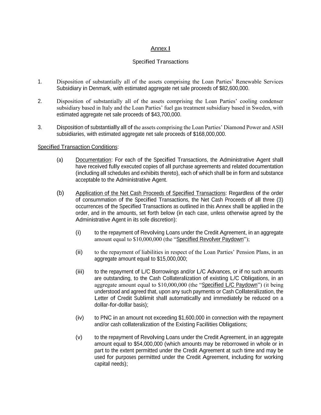 Annex I Specified Transactions 1. Disposition of substantially all of the assets comprising the Loan Parties’ Renewable Services Subsidiary in Denmark, with estimated aggregate net sale proceeds of $82,600,000. 2. Disposition of substantially all of the assets comprising the Loan Parties’ cooling condenser subsidiary based in Italy and the Loan Parties’ fuel gas treatment subsidiary based in Sweden, with estimated aggregate net sale proceeds of $43,700,000. 3. Disposition of substantially all of the assets comprising the Loan Parties’ Diamond Power and ASH subsidiaries, with estimated aggregate net sale proceeds of $168,000,000. Specified Transaction Conditions: (a) Documentation: For each of the Specified Transactions, the Administrative Agent shall have received fully executed copies of all purchase agreements and related documentation (including all schedules and exhibits thereto), each of which shall be in form and substance acceptable to the Administrative Agent. (b) Application of the Net Cash Proceeds of Specified Transactions: Regardless of the order of consummation of the Specified Transactions, the Net Cash Proceeds of all three (3) occurrences of the Specified Transactions as outlined in this Annex shall be applied in the order, and in the amounts, set forth below (in each case, unless otherwise agreed by the Administrative Agent in its sole discretion): (i) to the repayment of Revolving Loans under the Credit Agreement, in an aggregate amount equal to $10,000,000 (the “Specified Revolver Paydown”); (ii) to the repayment of liabilities in respect of the Loan Parties’ Pension Plans, in an aggregate amount equal to $15,000,000; (iii) to the repayment of L/C Borrowings and/or L/C Advances, or if no such amounts are outstanding, to the Cash Collateralization of existing L/C Obligations, in an aggregate amount equal to $10,000,000 (the “Specified L/C Paydown”) (it being understood and agreed that, upon any such payments or Cash Collateralization, the Letter of Credit Sublimit shall automatically and immediately be reduced on a dollar-for-dollar basis); (iv) to PNC in an amount not exceeding $1,600,000 in connection with the repayment and/or cash collateralization of the Existing Facilities Obligations; (v) to the repayment of Revolving Loans under the Credit Agreement, in an aggregate amount equal to $54,000,000 (which amounts may be reborrowed in whole or in part to the extent permitted under the Credit Agreement at such time and may be used for purposes permitted under the Credit Agreement, including for working capital needs);