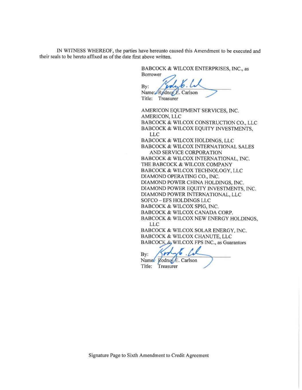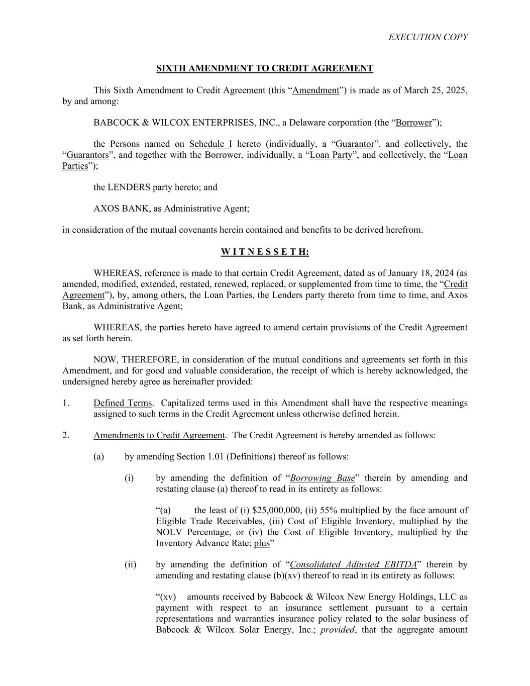 EXECUTION COPY SIXTH AMENDMENT TO CREDIT AGREEMENT This Sixth Amendment to Credit Agreement (this “Amendment”) is made as of March 25, 2025, by and among: BABCOCK & WILCOX ENTERPRISES, INC., a Delaware corporation (the “Borrower”); the Persons named on Schedule I hereto (individually, a “Guarantor”, and collectively, the “Guarantors”, and together with the Borrower, individually, a “Loan Party”, and collectively, the “Loan Parties”); the LENDERS party hereto; and AXOS BANK, as Administrative Agent; in consideration of the mutual covenants herein contained and benefits to be derived herefrom. W I T N E S S E T H: WHEREAS, reference is made to that certain Credit Agreement, dated as of January 18, 2024 (as amended, modified, extended, restated, renewed, replaced, or supplemented from time to time, the “Credit Agreement”), by, among others, the Loan Parties, the Lenders party thereto from time to time, and Axos Bank, as Administrative Agent; WHEREAS, the parties hereto have agreed to amend certain provisions of the Credit Agreement as set forth herein. NOW, THEREFORE, in consideration of the mutual conditions and agreements set forth in this Amendment, and for good and valuable consideration, the receipt of which is hereby acknowledged, the undersigned hereby agree as hereinafter provided: 1. Defined Terms. Capitalized terms used in this Amendment shall have the respective meanings assigned to such terms in the Credit Agreement unless otherwise defined herein. 2. Amendments to Credit Agreement. The Credit Agreement is hereby amended as follows: (a) by amending Section 1.01 (Definitions) thereof as follows: (i) by amending the definition of “Borrowing Base” therein by amending and restating clause (a) thereof to read in its entirety as follows: “(a) the least of (i) $25,000,000, (ii) 55% multiplied by the face amount of Eligible Trade Receivables, (iii) Cost of Eligible Inventory, multiplied by the NOLV Percentage, or (iv) the Cost of Eligible Inventory, multiplied by the Inventory Advance Rate; plus” (ii) by amending the definition of “Consolidated Adjusted EBITDA” therein by amending and restating clause (b)(xv) thereof to read in its entirety as follows: “(xv) amounts received by Babcock & Wilcox New Energy Holdings, LLC as payment with respect to an insurance settlement pursuant to a certain representations and warranties insurance policy related to the solar business of Babcock & Wilcox Solar Energy, Inc.; provided, that the aggregate amount