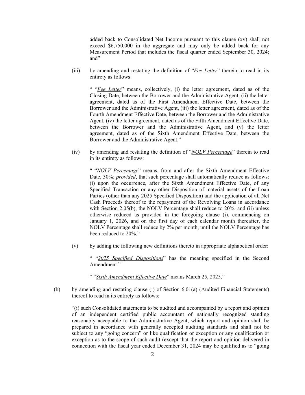 2 added back to Consolidated Net Income pursuant to this clause (xv) shall not exceed $6,750,000 in the aggregate and may only be added back for any Measurement Period that includes the fiscal quarter ended September 30, 2024; and” (iii) by amending and restating the definition of “Fee Letter” therein to read in its entirety as follows: “ “Fee Letter” means, collectively, (i) the letter agreement, dated as of the Closing Date, between the Borrower and the Administrative Agent, (ii) the letter agreement, dated as of the First Amendment Effective Date, between the Borrower and the Administrative Agent, (iii) the letter agreement, dated as of the Fourth Amendment Effective Date, between the Borrower and the Administrative Agent, (iv) the letter agreement, dated as of the Fifth Amendment Effective Date, between the Borrower and the Administrative Agent, and (v) the letter agreement, dated as of the Sixth Amendment Effective Date, between the Borrower and the Administrative Agent.” (iv) by amending and restating the definition of “NOLV Percentage” therein to read in its entirety as follows: “ “NOLV Percentage” means, from and after the Sixth Amendment Effective Date, 30%; provided, that such percentage shall automatically reduce as follows: (i) upon the occurrence, after the Sixth Amendment Effective Date, of any Specified Transaction or any other Disposition of material assets of the Loan Parties (other than any 2025 Specified Disposition) and the application of all Net Cash Proceeds thereof to the repayment of the Revolving Loans in accordance with Section 2.05(b), the NOLV Percentage shall reduce to 20%, and (ii) unless otherwise reduced as provided in the foregoing clause (i), commencing on January 1, 2026, and on the first day of each calendar month thereafter, the NOLV Percentage shall reduce by 2% per month, until the NOLV Percentage has been reduced to 20%.” (v) by adding the following new definitions thereto in appropriate alphabetical order: “ “2025 Specified Dispositions” has the meaning specified in the Second Amendment.” “ “Sixth Amendment Effective Date” means March 25, 2025.” (b) by amending and restating clause (i) of Section 6.01(a) (Audited Financial Statements) thereof to read in its entirety as follows: “(i) such Consolidated statements to be audited and accompanied by a report and opinion of an independent certified public accountant of nationally recognized standing reasonably acceptable to the Administrative Agent, which report and opinion shall be prepared in accordance with generally accepted auditing standards and shall not be subject to any “going concern” or like qualification or exception or any qualification or exception as to the scope of such audit (except that the report and opinion delivered in connection with the fiscal year ended December 31, 2024 may be qualified as to “going