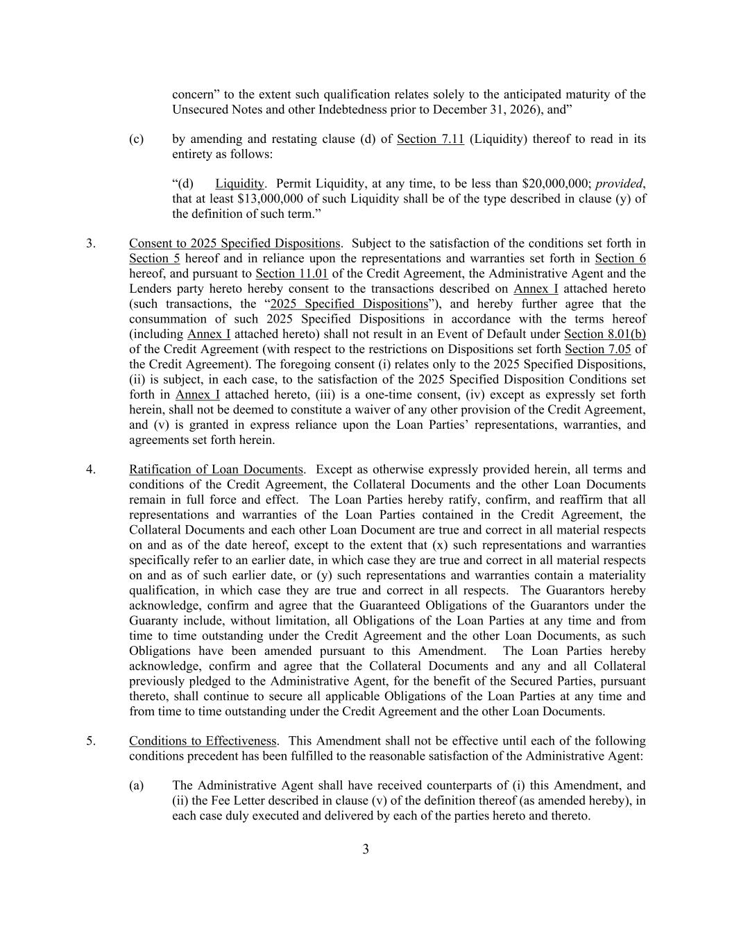 3 concern” to the extent such qualification relates solely to the anticipated maturity of the Unsecured Notes and other Indebtedness prior to December 31, 2026), and” (c) by amending and restating clause (d) of Section 7.11 (Liquidity) thereof to read in its entirety as follows: “(d) Liquidity. Permit Liquidity, at any time, to be less than $20,000,000; provided, that at least $13,000,000 of such Liquidity shall be of the type described in clause (y) of the definition of such term.” 3. Consent to 2025 Specified Dispositions. Subject to the satisfaction of the conditions set forth in Section 5 hereof and in reliance upon the representations and warranties set forth in Section 6 hereof, and pursuant to Section 11.01 of the Credit Agreement, the Administrative Agent and the Lenders party hereto hereby consent to the transactions described on Annex I attached hereto (such transactions, the “2025 Specified Dispositions”), and hereby further agree that the consummation of such 2025 Specified Dispositions in accordance with the terms hereof (including Annex I attached hereto) shall not result in an Event of Default under Section 8.01(b) of the Credit Agreement (with respect to the restrictions on Dispositions set forth Section 7.05 of the Credit Agreement). The foregoing consent (i) relates only to the 2025 Specified Dispositions, (ii) is subject, in each case, to the satisfaction of the 2025 Specified Disposition Conditions set forth in Annex I attached hereto, (iii) is a one-time consent, (iv) except as expressly set forth herein, shall not be deemed to constitute a waiver of any other provision of the Credit Agreement, and (v) is granted in express reliance upon the Loan Parties’ representations, warranties, and agreements set forth herein. 4. Ratification of Loan Documents. Except as otherwise expressly provided herein, all terms and conditions of the Credit Agreement, the Collateral Documents and the other Loan Documents remain in full force and effect. The Loan Parties hereby ratify, confirm, and reaffirm that all representations and warranties of the Loan Parties contained in the Credit Agreement, the Collateral Documents and each other Loan Document are true and correct in all material respects on and as of the date hereof, except to the extent that (x) such representations and warranties specifically refer to an earlier date, in which case they are true and correct in all material respects on and as of such earlier date, or (y) such representations and warranties contain a materiality qualification, in which case they are true and correct in all respects. The Guarantors hereby acknowledge, confirm and agree that the Guaranteed Obligations of the Guarantors under the Guaranty include, without limitation, all Obligations of the Loan Parties at any time and from time to time outstanding under the Credit Agreement and the other Loan Documents, as such Obligations have been amended pursuant to this Amendment. The Loan Parties hereby acknowledge, confirm and agree that the Collateral Documents and any and all Collateral previously pledged to the Administrative Agent, for the benefit of the Secured Parties, pursuant thereto, shall continue to secure all applicable Obligations of the Loan Parties at any time and from time to time outstanding under the Credit Agreement and the other Loan Documents. 5. Conditions to Effectiveness. This Amendment shall not be effective until each of the following conditions precedent has been fulfilled to the reasonable satisfaction of the Administrative Agent: (a) The Administrative Agent shall have received counterparts of (i) this Amendment, and (ii) the Fee Letter described in clause (v) of the definition thereof (as amended hereby), in each case duly executed and delivered by each of the parties hereto and thereto.