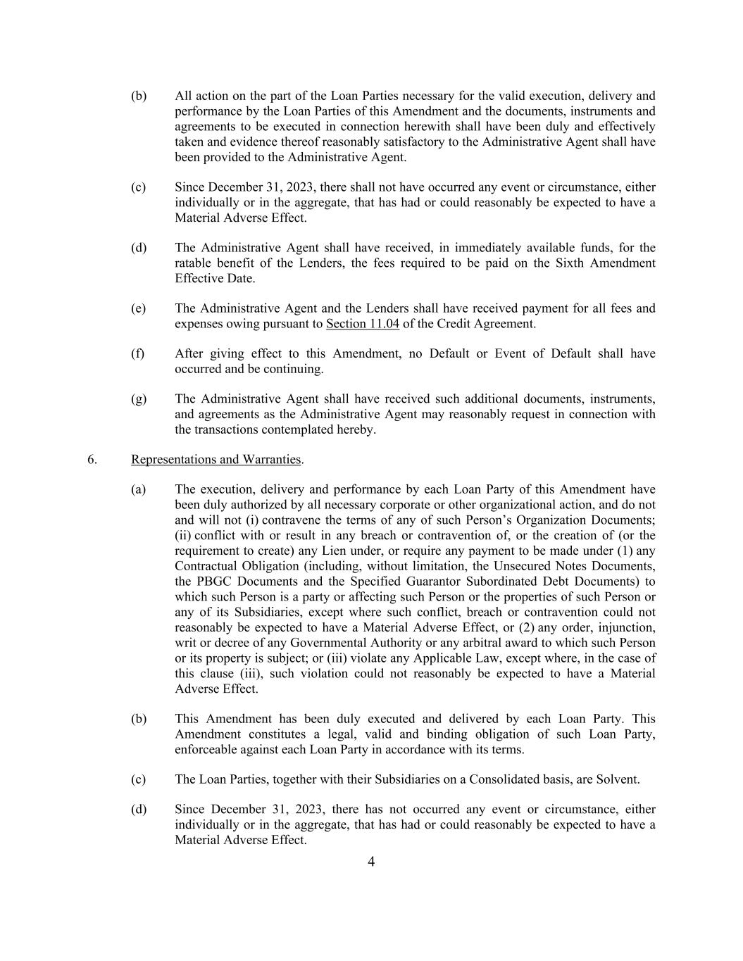 4 (b) All action on the part of the Loan Parties necessary for the valid execution, delivery and performance by the Loan Parties of this Amendment and the documents, instruments and agreements to be executed in connection herewith shall have been duly and effectively taken and evidence thereof reasonably satisfactory to the Administrative Agent shall have been provided to the Administrative Agent. (c) Since December 31, 2023, there shall not have occurred any event or circumstance, either individually or in the aggregate, that has had or could reasonably be expected to have a Material Adverse Effect. (d) The Administrative Agent shall have received, in immediately available funds, for the ratable benefit of the Lenders, the fees required to be paid on the Sixth Amendment Effective Date. (e) The Administrative Agent and the Lenders shall have received payment for all fees and expenses owing pursuant to Section 11.04 of the Credit Agreement. (f) After giving effect to this Amendment, no Default or Event of Default shall have occurred and be continuing. (g) The Administrative Agent shall have received such additional documents, instruments, and agreements as the Administrative Agent may reasonably request in connection with the transactions contemplated hereby. 6. Representations and Warranties. (a) The execution, delivery and performance by each Loan Party of this Amendment have been duly authorized by all necessary corporate or other organizational action, and do not and will not (i) contravene the terms of any of such Person’s Organization Documents; (ii) conflict with or result in any breach or contravention of, or the creation of (or the requirement to create) any Lien under, or require any payment to be made under (1) any Contractual Obligation (including, without limitation, the Unsecured Notes Documents, the PBGC Documents and the Specified Guarantor Subordinated Debt Documents) to which such Person is a party or affecting such Person or the properties of such Person or any of its Subsidiaries, except where such conflict, breach or contravention could not reasonably be expected to have a Material Adverse Effect, or (2) any order, injunction, writ or decree of any Governmental Authority or any arbitral award to which such Person or its property is subject; or (iii) violate any Applicable Law, except where, in the case of this clause (iii), such violation could not reasonably be expected to have a Material Adverse Effect. (b) This Amendment has been duly executed and delivered by each Loan Party. This Amendment constitutes a legal, valid and binding obligation of such Loan Party, enforceable against each Loan Party in accordance with its terms. (c) The Loan Parties, together with their Subsidiaries on a Consolidated basis, are Solvent. (d) Since December 31, 2023, there has not occurred any event or circumstance, either individually or in the aggregate, that has had or could reasonably be expected to have a Material Adverse Effect.