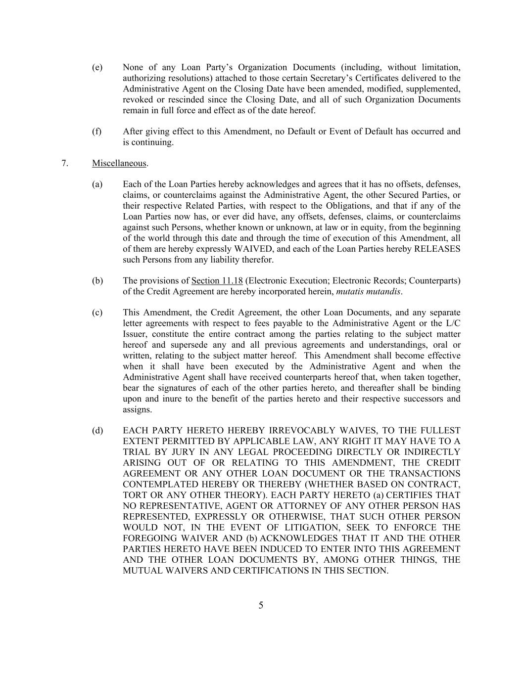 5 (e) None of any Loan Party’s Organization Documents (including, without limitation, authorizing resolutions) attached to those certain Secretary’s Certificates delivered to the Administrative Agent on the Closing Date have been amended, modified, supplemented, revoked or rescinded since the Closing Date, and all of such Organization Documents remain in full force and effect as of the date hereof. (f) After giving effect to this Amendment, no Default or Event of Default has occurred and is continuing. 7. Miscellaneous. (a) Each of the Loan Parties hereby acknowledges and agrees that it has no offsets, defenses, claims, or counterclaims against the Administrative Agent, the other Secured Parties, or their respective Related Parties, with respect to the Obligations, and that if any of the Loan Parties now has, or ever did have, any offsets, defenses, claims, or counterclaims against such Persons, whether known or unknown, at law or in equity, from the beginning of the world through this date and through the time of execution of this Amendment, all of them are hereby expressly WAIVED, and each of the Loan Parties hereby RELEASES such Persons from any liability therefor. (b) The provisions of Section 11.18 (Electronic Execution; Electronic Records; Counterparts) of the Credit Agreement are hereby incorporated herein, mutatis mutandis. (c) This Amendment, the Credit Agreement, the other Loan Documents, and any separate letter agreements with respect to fees payable to the Administrative Agent or the L/C Issuer, constitute the entire contract among the parties relating to the subject matter hereof and supersede any and all previous agreements and understandings, oral or written, relating to the subject matter hereof. This Amendment shall become effective when it shall have been executed by the Administrative Agent and when the Administrative Agent shall have received counterparts hereof that, when taken together, bear the signatures of each of the other parties hereto, and thereafter shall be binding upon and inure to the benefit of the parties hereto and their respective successors and assigns. (d) EACH PARTY HERETO HEREBY IRREVOCABLY WAIVES, TO THE FULLEST EXTENT PERMITTED BY APPLICABLE LAW, ANY RIGHT IT MAY HAVE TO A TRIAL BY JURY IN ANY LEGAL PROCEEDING DIRECTLY OR INDIRECTLY ARISING OUT OF OR RELATING TO THIS AMENDMENT, THE CREDIT AGREEMENT OR ANY OTHER LOAN DOCUMENT OR THE TRANSACTIONS CONTEMPLATED HEREBY OR THEREBY (WHETHER BASED ON CONTRACT, TORT OR ANY OTHER THEORY). EACH PARTY HERETO (a) CERTIFIES THAT NO REPRESENTATIVE, AGENT OR ATTORNEY OF ANY OTHER PERSON HAS REPRESENTED, EXPRESSLY OR OTHERWISE, THAT SUCH OTHER PERSON WOULD NOT, IN THE EVENT OF LITIGATION, SEEK TO ENFORCE THE FOREGOING WAIVER AND (b) ACKNOWLEDGES THAT IT AND THE OTHER PARTIES HERETO HAVE BEEN INDUCED TO ENTER INTO THIS AGREEMENT AND THE OTHER LOAN DOCUMENTS BY, AMONG OTHER THINGS, THE MUTUAL WAIVERS AND CERTIFICATIONS IN THIS SECTION.