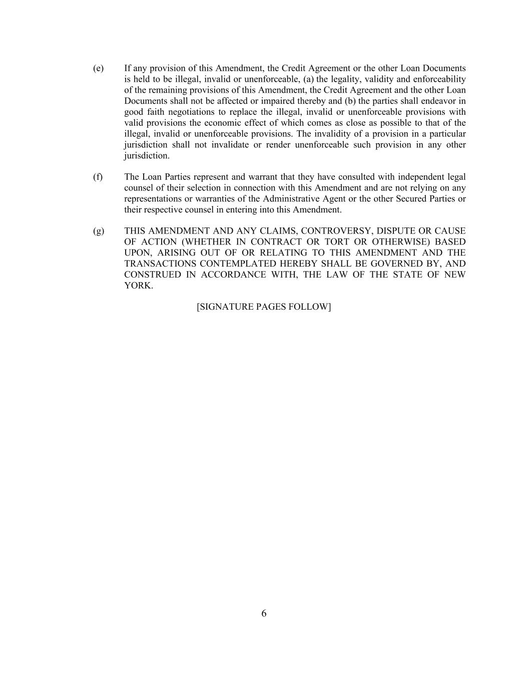 6 (e) If any provision of this Amendment, the Credit Agreement or the other Loan Documents is held to be illegal, invalid or unenforceable, (a) the legality, validity and enforceability of the remaining provisions of this Amendment, the Credit Agreement and the other Loan Documents shall not be affected or impaired thereby and (b) the parties shall endeavor in good faith negotiations to replace the illegal, invalid or unenforceable provisions with valid provisions the economic effect of which comes as close as possible to that of the illegal, invalid or unenforceable provisions. The invalidity of a provision in a particular jurisdiction shall not invalidate or render unenforceable such provision in any other jurisdiction. (f) The Loan Parties represent and warrant that they have consulted with independent legal counsel of their selection in connection with this Amendment and are not relying on any representations or warranties of the Administrative Agent or the other Secured Parties or their respective counsel in entering into this Amendment. (g) THIS AMENDMENT AND ANY CLAIMS, CONTROVERSY, DISPUTE OR CAUSE OF ACTION (WHETHER IN CONTRACT OR TORT OR OTHERWISE) BASED UPON, ARISING OUT OF OR RELATING TO THIS AMENDMENT AND THE TRANSACTIONS CONTEMPLATED HEREBY SHALL BE GOVERNED BY, AND CONSTRUED IN ACCORDANCE WITH, THE LAW OF THE STATE OF NEW YORK. [SIGNATURE PAGES FOLLOW]