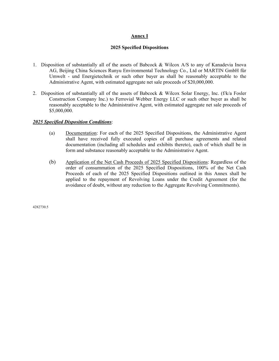Annex I 2025 Specified Dispositions 1. Disposition of substantially all of the assets of Babcock & Wilcox A/S to any of Kanadevia Inova AG, Beijing China Sciences Runyu Environmental Technology Co., Ltd or MARTIN GmbH für Umwelt - und Energietechnik or such other buyer as shall be reasonably acceptable to the Administrative Agent, with estimated aggregate net sale proceeds of $20,000,000. 2. Disposition of substantially all of the assets of Babcock & Wilcox Solar Energy, Inc. (f/k/a Fosler Construction Company Inc.) to Ferrovial Webber Energy LLC or such other buyer as shall be reasonably acceptable to the Administrative Agent, with estimated aggregate net sale proceeds of $5,000,000. 2025 Specified Disposition Conditions: (a) Documentation: For each of the 2025 Specified Dispositions, the Administrative Agent shall have received fully executed copies of all purchase agreements and related documentation (including all schedules and exhibits thereto), each of which shall be in form and substance reasonably acceptable to the Administrative Agent. (b) Application of the Net Cash Proceeds of 2025 Specified Dispositions: Regardless of the order of consummation of the 2025 Specified Dispositions, 100% of the Net Cash Proceeds of each of the 2025 Specified Dispositions outlined in this Annex shall be applied to the repayment of Revolving Loans under the Credit Agreement (for the avoidance of doubt, without any reduction to the Aggregate Revolving Commitments). 4282730.5