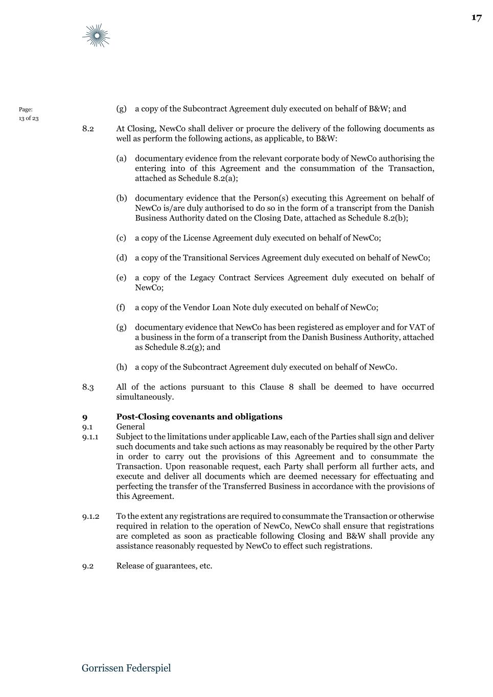 Page: 13 of 23 (g) a copy of the Subcontract Agreement duly executed on behalf of B&W; and 8.2 At Closing, NewCo shall deliver or procure the delivery of the following documents as well as perform the following actions, as applicable, to B&W: (a) documentary evidence from the relevant corporate body of NewCo authorising the entering into of this Agreement and the consummation of the Transaction, attached as Schedule 8.2(a); (b) documentary evidence that the Person(s) executing this Agreement on behalf of NewCo is/are duly authorised to do so in the form of a transcript from the Danish Business Authority dated on the Closing Date, attached as Schedule 8.2(b); (c) a copy of the License Agreement duly executed on behalf of NewCo; (d) a copy of the Transitional Services Agreement duly executed on behalf of NewCo; (e) a copy of the Legacy Contract Services Agreement duly executed on behalf of NewCo; (f) a copy of the Vendor Loan Note duly executed on behalf of NewCo; (g) documentary evidence that NewCo has been registered as employer and for VAT of a business in the form of a transcript from the Danish Business Authority, attached as Schedule 8.2(g); and (h) a copy of the Subcontract Agreement duly executed on behalf of NewCo. 8.3 All of the actions pursuant to this Clause 8 shall be deemed to have occurred simultaneously. 9 Post-Closing covenants and obligations 9.1 General 9.1.1 Subject to the limitations under applicable Law, each of the Parties shall sign and deliver such documents and take such actions as may reasonably be required by the other Party in order to carry out the provisions of this Agreement and to consummate the Transaction. Upon reasonable request, each Party shall perform all further acts, and execute and deliver all documents which are deemed necessary for effectuating and perfecting the transfer of the Transferred Business in accordance with the provisions of this Agreement. 9.1.2 To the extent any registrations are required to consummate the Transaction or otherwise required in relation to the operation of NewCo, NewCo shall ensure that registrations are completed as soon as practicable following Closing and B&W shall provide any assistance reasonably requested by NewCo to effect such registrations. 9.2 Release of guarantees, etc. 17