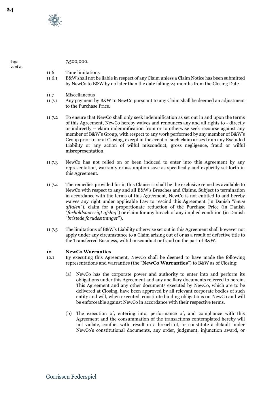 Page: 20 of 23 7,500,000. 11.6 Time limitations 11.6.1 B&W shall not be liable in respect of any Claim unless a Claim Notice has been submitted by NewCo to B&W by no later than the date falling 24 months from the Closing Date. 11.7 Miscellaneous 11.7.1 Any payment by B&W to NewCo pursuant to any Claim shall be deemed an adjustment to the Purchase Price. 11.7.2 To ensure that NewCo shall only seek indemnification as set out in and upon the terms of this Agreement, NewCo hereby waives and renounces any and all rights to - directly or indirectly – claim indemnification from or to otherwise seek recourse against any member of B&W’s Group, with respect to any work performed by any member of B&W’s Group prior to or at Closing, except in the event of such claim arises from any Excluded Liability or any action of wilful misconduct, gross negligence, fraud or wilful misrepresentation. 11.7.3 NewCo has not relied on or been induced to enter into this Agreement by any representation, warranty or assumption save as specifically and explicitly set forth in this Agreement. 11.7.4 The remedies provided for in this Clause 11 shall be the exclusive remedies available to NewCo with respect to any and all B&W’s Breaches and Claims. Subject to termination in accordance with the terms of this Agreement, NewCo is not entitled to and hereby waives any right under applicable Law to rescind this Agreement (in Danish “hæve aftalen”), claim for a proportionate reduction of the Purchase Price (in Danish “forholdsmæssigt afslag”) or claim for any breach of any implied condition (in Danish “bristede forudsætninger”). 11.7.5 The limitations of B&W’s Liability otherwise set out in this Agreement shall however not apply under any circumstance to a Claim arising out of or as a result of defective title to the Transferred Business, wilful misconduct or fraud on the part of B&W. 12 NewCo Warranties 12.1 By executing this Agreement, NewCo shall be deemed to have made the following representations and warranties (the “NewCo Warranties”) to B&W as of Closing: (a) NewCo has the corporate power and authority to enter into and perform its obligations under this Agreement and any ancillary documents referred to herein. This Agreement and any other documents executed by NewCo, which are to be delivered at Closing, have been approved by all relevant corporate bodies of such entity and will, when executed, constitute binding obligations on NewCo and will be enforceable against NewCo in accordance with their respective terms. (b) The execution of, entering into, performance of, and compliance with this Agreement and the consummation of the transactions contemplated hereby will not violate, conflict with, result in a breach of, or constitute a default under NewCo’s constitutional documents, any order, judgment, injunction award, or 24