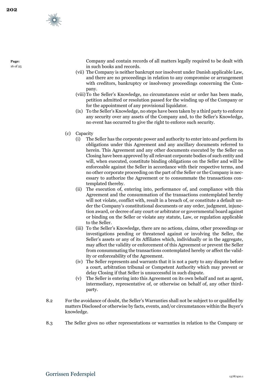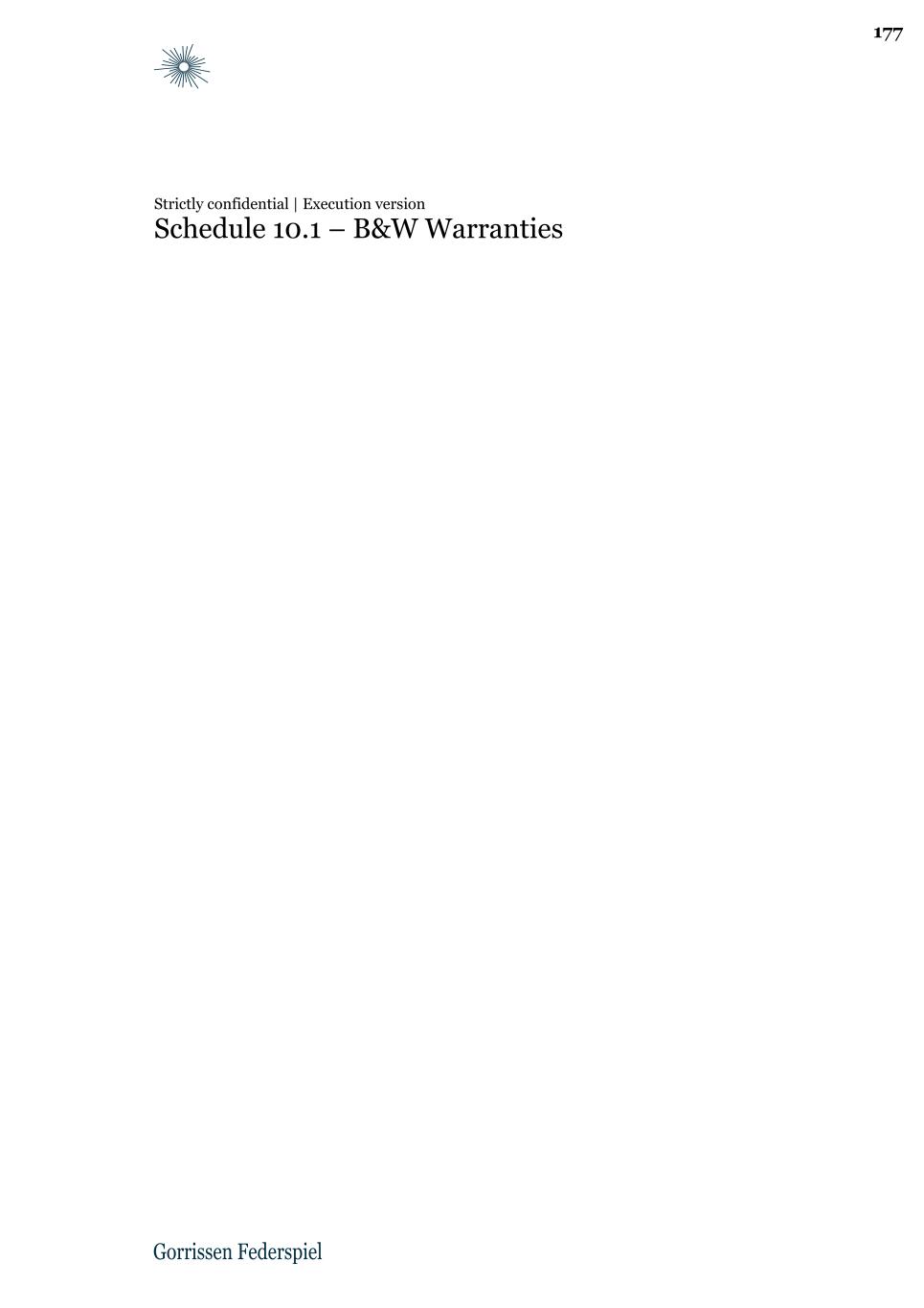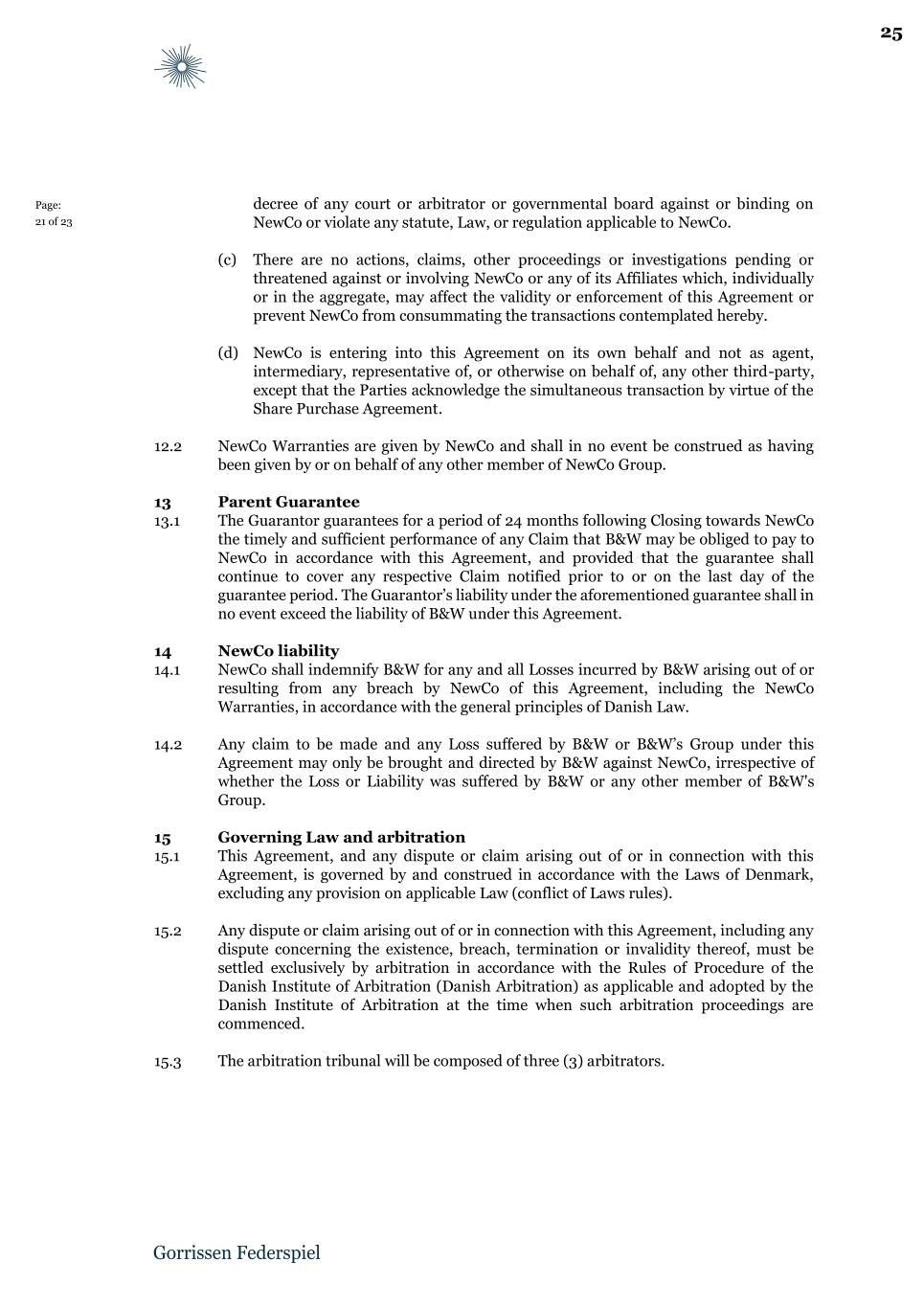 Page: 21 of 23 decree of any court or arbitrator or governmental board against or binding on NewCo or violate any statute, Law, or regulation applicable to NewCo. (c) There are no actions, claims, other proceedings or investigations pending or threatened against or involving NewCo or any of its Affiliates which, individually or in the aggregate, may affect the validity or enforcement of this Agreement or prevent NewCo from consummating the transactions contemplated hereby. (d) NewCo is entering into this Agreement on its own behalf and not as agent, intermediary, representative of, or otherwise on behalf of, any other third-party, except that the Parties acknowledge the simultaneous transaction by virtue of the Share Purchase Agreement. 12.2 NewCo Warranties are given by NewCo and shall in no event be construed as having been given by or on behalf of any other member of NewCo Group. 13 Parent Guarantee 13.1 The Guarantor guarantees for a period of 24 months following Closing towards NewCo the timely and sufficient performance of any Claim that B&W may be obliged to pay to NewCo in accordance with this Agreement, and provided that the guarantee shall continue to cover any respective Claim notified prior to or on the last day of the guarantee period. The Guarantor’s liability under the aforementioned guarantee shall in no event exceed the liability of B&W under this Agreement. 14 NewCo liability 14.1 NewCo shall indemnify B&W for any and all Losses incurred by B&W arising out of or resulting from any breach by NewCo of this Agreement, including the NewCo Warranties, in accordance with the general principles of Danish Law. 14.2 Any claim to be made and any Loss suffered by B&W or B&W’s Group under this Agreement may only be brought and directed by B&W against NewCo, irrespective of whether the Loss or Liability was suffered by B&W or any other member of B&W's Group. 15 Governing Law and arbitration 15.1 This Agreement, and any dispute or claim arising out of or in connection with this Agreement, is governed by and construed in accordance with the Laws of Denmark, excluding any provision on applicable Law (conflict of Laws rules). 15.2 Any dispute or claim arising out of or in connection with this Agreement, including any dispute concerning the existence, breach, termination or invalidity thereof, must be settled exclusively by arbitration in accordance with the Rules of Procedure of the Danish Institute of Arbitration (Danish Arbitration) as applicable and adopted by the Danish Institute of Arbitration at the time when such arbitration proceedings are commenced. 15.3 The arbitration tribunal will be composed of three (3) arbitrators. 25