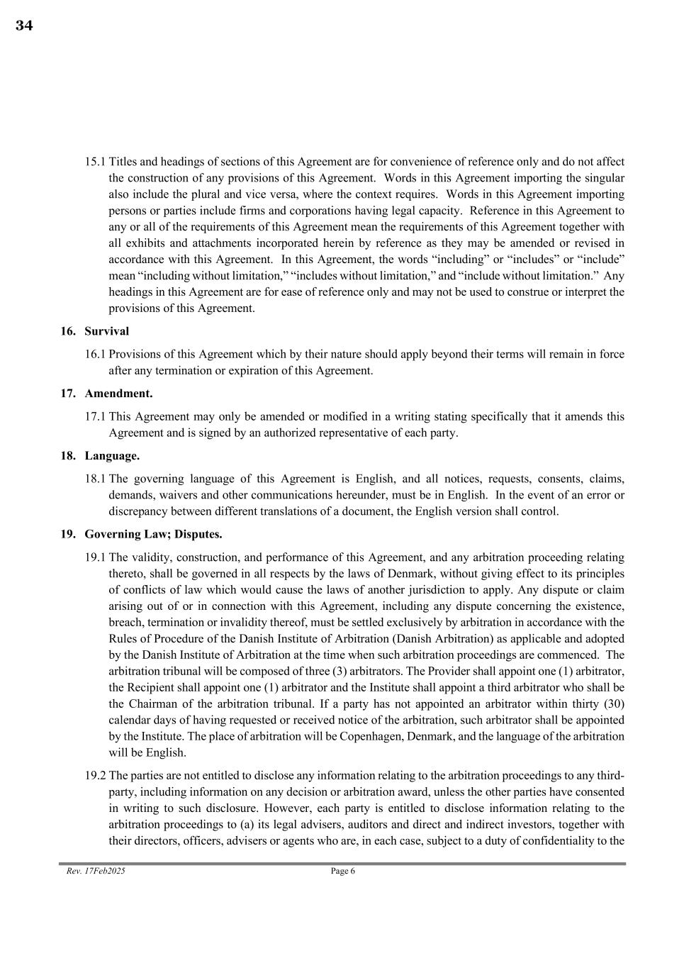 Rev. 17Feb2025 Page 6 15.1 Titles and headings of sections of this Agreement are for convenience of reference only and do not affect the construction of any provisions of this Agreement. Words in this Agreement importing the singular also include the plural and vice versa, where the context requires. Words in this Agreement importing persons or parties include firms and corporations having legal capacity. Reference in this Agreement to any or all of the requirements of this Agreement mean the requirements of this Agreement together with all exhibits and attachments incorporated herein by reference as they may be amended or revised in accordance with this Agreement. In this Agreement, the words “including” or “includes” or “include” mean “including without limitation,” “includes without limitation,” and “include without limitation.” Any headings in this Agreement are for ease of reference only and may not be used to construe or interpret the provisions of this Agreement. 16. Survival 16.1 Provisions of this Agreement which by their nature should apply beyond their terms will remain in force after any termination or expiration of this Agreement. 17. Amendment. 17.1 This Agreement may only be amended or modified in a writing stating specifically that it amends this Agreement and is signed by an authorized representative of each party. 18. Language. 18.1 The governing language of this Agreement is English, and all notices, requests, consents, claims, demands, waivers and other communications hereunder, must be in English. In the event of an error or discrepancy between different translations of a document, the English version shall control. 19. Governing Law; Disputes. 19.1 The validity, construction, and performance of this Agreement, and any arbitration proceeding relating thereto, shall be governed in all respects by the laws of Denmark, without giving effect to its principles of conflicts of law which would cause the laws of another jurisdiction to apply. Any dispute or claim arising out of or in connection with this Agreement, including any dispute concerning the existence, breach, termination or invalidity thereof, must be settled exclusively by arbitration in accordance with the Rules of Procedure of the Danish Institute of Arbitration (Danish Arbitration) as applicable and adopted by the Danish Institute of Arbitration at the time when such arbitration proceedings are commenced. The arbitration tribunal will be composed of three (3) arbitrators. The Provider shall appoint one (1) arbitrator, the Recipient shall appoint one (1) arbitrator and the Institute shall appoint a third arbitrator who shall be the Chairman of the arbitration tribunal. If a party has not appointed an arbitrator within thirty (30) calendar days of having requested or received notice of the arbitration, such arbitrator shall be appointed by the Institute. The place of arbitration will be Copenhagen, Denmark, and the language of the arbitration will be English. 19.2 The parties are not entitled to disclose any information relating to the arbitration proceedings to any third- party, including information on any decision or arbitration award, unless the other parties have consented in writing to such disclosure. However, each party is entitled to disclose information relating to the arbitration proceedings to (a) its legal advisers, auditors and direct and indirect investors, together with their directors, officers, advisers or agents who are, in each case, subject to a duty of confidentiality to the 34