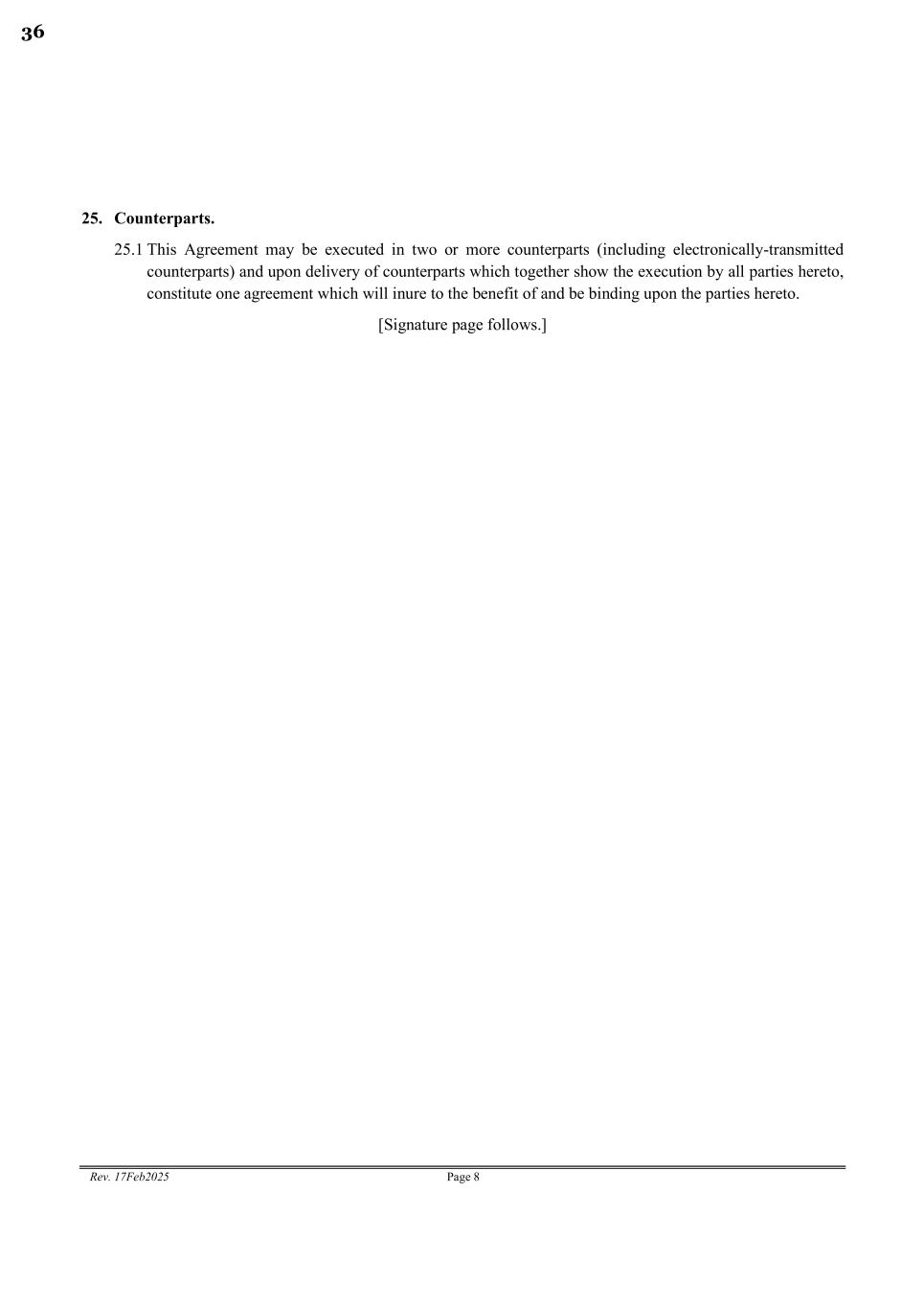 Rev. 17Feb2025 Page 8 25. Counterparts. 25.1 This Agreement may be executed in two or more counterparts (including electronically-transmitted counterparts) and upon delivery of counterparts which together show the execution by all parties hereto, constitute one agreement which will inure to the benefit of and be binding upon the parties hereto. [Signature page follows.] 36