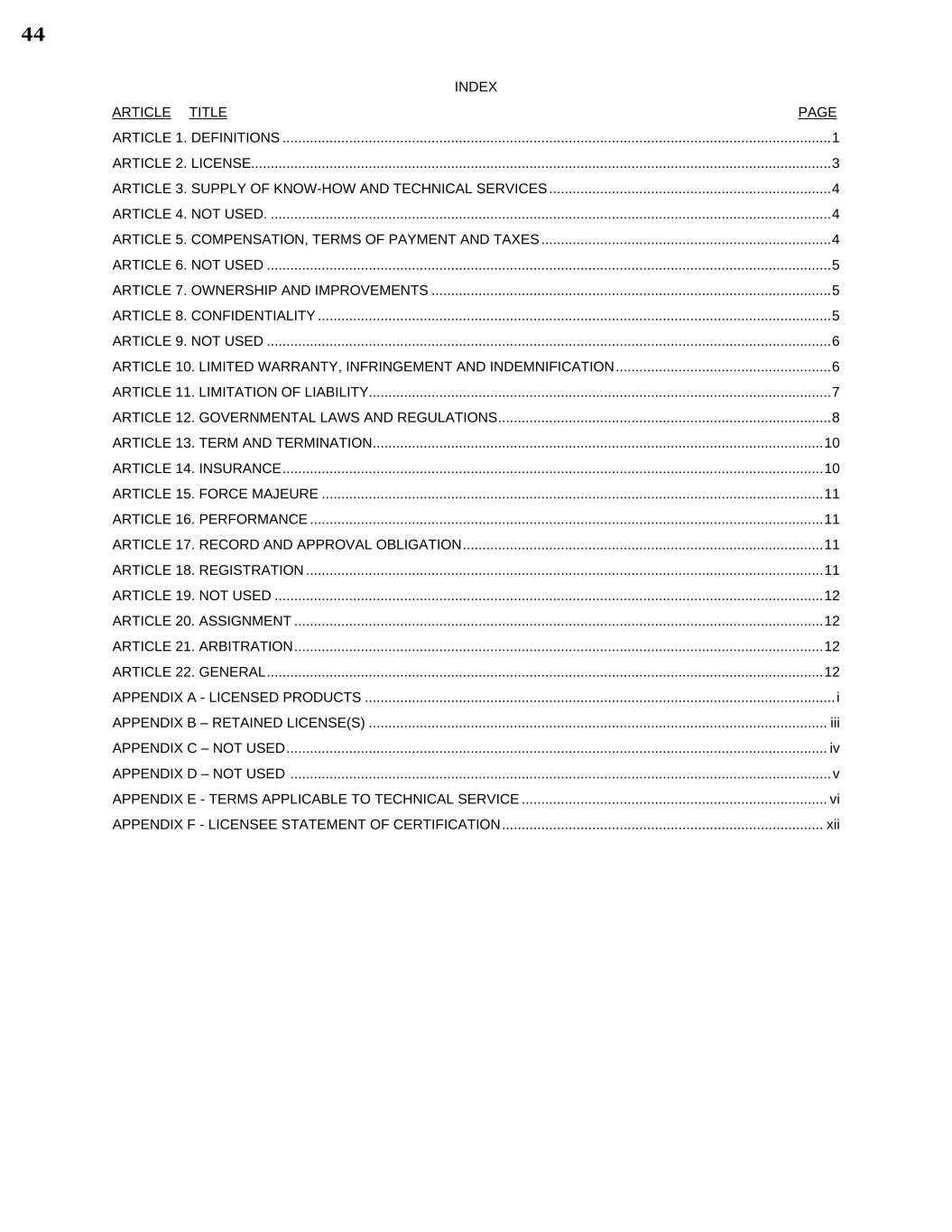 INDEX ARTICLE TITLE PAGE ARTICLE 1. DEFINITIONS ............................................................................................................................................ 1 ARTICLE 2. LICENSE.................................................................................................................................................... 3 ARTICLE 3. SUPPLY OF KNOW-HOW AND TECHNICAL SERVICES ........................................................................ 4 ARTICLE 4. NOT USED. ............................................................................................................................................... 4 ARTICLE 5. COMPENSATION, TERMS OF PAYMENT AND TAXES .......................................................................... 4 ARTICLE 6. NOT USED ................................................................................................................................................ 5 ARTICLE 7. OWNERSHIP AND IMPROVEMENTS ...................................................................................................... 5 ARTICLE 8. CONFIDENTIALITY ................................................................................................................................... 5 ARTICLE 9. NOT USED ................................................................................................................................................ 6 ARTICLE 10. LIMITED WARRANTY, INFRINGEMENT AND INDEMNIFICATION ....................................................... 6 ARTICLE 11. LIMITATION OF LIABILITY...................................................................................................................... 7 ARTICLE 12. GOVERNMENTAL LAWS AND REGULATIONS ..................................................................................... 8 ARTICLE 13. TERM AND TERMINATION ................................................................................................................... 10 ARTICLE 14. INSURANCE .......................................................................................................................................... 10 ARTICLE 15. FORCE MAJEURE ................................................................................................................................ 11 ARTICLE 16. PERFORMANCE ................................................................................................................................... 11 ARTICLE 17. RECORD AND APPROVAL OBLIGATION ............................................................................................ 11 ARTICLE 18. REGISTRATION .................................................................................................................................... 11 ARTICLE 19. NOT USED ............................................................................................................................................ 12 ARTICLE 20. ASSIGNMENT ....................................................................................................................................... 12 ARTICLE 21. ARBITRATION ....................................................................................................................................... 12 ARTICLE 22. GENERAL .............................................................................................................................................. 12 APPENDIX A - LICENSED PRODUCTS ........................................................................................................................ i APPENDIX B – RETAINED LICENSE(S) ..................................................................................................................... iii APPENDIX C – NOT USED .......................................................................................................................................... iv APPENDIX D – NOT USED .......................................................................................................................................... v APPENDIX E - TERMS APPLICABLE TO TECHNICAL SERVICE .............................................................................. vi APPENDIX F - LICENSEE STATEMENT OF CERTIFICATION .................................................................................. xii 44