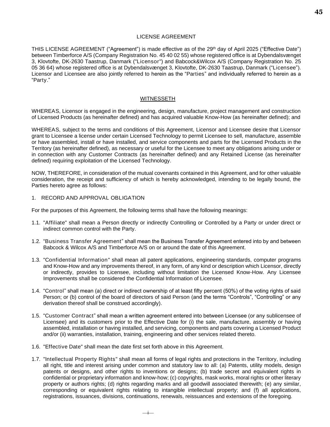 ⎯i⎯ LICENSE AGREEMENT THIS LICENSE AGREEMENT (“Agreement”) is made effective as of the 29th day of April 2025 (“Effective Date”) between Timberforce A/S (Company Registration No. 45 40 02 55) whose registered office is at Dybendalsvænget 3, Klovtofte, DK-2630 Taastrup, Danmark ("Licensor") and Babcock&Wilcox A/S (Company Registration No. 25 05 36 64) whose registered office is at Dybendalsvænget 3, Klovtofte, DK-2630 Taastrup, Danmark (“Licensee”). Licensor and Licensee are also jointly referred to herein as the “Parties” and individually referred to herein as a “Party.” WITNESSETH WHEREAS, Licensor is engaged in the engineering, design, manufacture, project management and construction of Licensed Products (as hereinafter defined) and has acquired valuable Know-How (as hereinafter defined); and WHEREAS, subject to the terms and conditions of this Agreement, Licensor and Licensee desire that Licensor grant to Licensee a license under certain Licensed Technology to permit Licensee to sell, manufacture, assemble or have assembled, install or have installed, and service components and parts for the Licensed Products in the Territory (as hereinafter defined), as necessary or useful for the Licensee to meet any obligations arising under or in connection with any Customer Contracts (as hereinafter defined) and any Retained License (as hereinafter defined) requiring exploitation of the Licensed Technology. NOW, THEREFORE, in consideration of the mutual covenants contained in this Agreement, and for other valuable consideration, the receipt and sufficiency of which is hereby acknowledged, intending to be legally bound, the Parties hereto agree as follows: 1. RECORD AND APPROVAL OBLIGATION For the purposes of this Agreement, the following terms shall have the following meanings: 1.1. "Affiliate" shall mean a Person directly or indirectly Controlling or Controlled by a Party or under direct or indirect common control with the Party. 1.2. “Business Transfer Agreement” shall mean the Business Transfer Agreement entered into by and between Babcock & Wilcox A/S and Timberforce A/S on or around the date of this Agreement. 1.3. "Confidential Information" shall mean all patent applications, engineering standards, computer programs and Know-How and any improvements thereof, in any form, of any kind or description which Licensor, directly or indirectly, provides to Licensee, including without limitation the Licensed Know-How. Any Licensee Improvements shall be considered the Confidential Information of Licensee. 1.4. “Control” shall mean (a) direct or indirect ownership of at least fifty percent (50%) of the voting rights of said Person; or (b) control of the board of directors of said Person (and the terms “Controls”, “Controlling” or any derivation thereof shall be construed accordingly). 1.5. “Customer Contract” shall mean a written agreement entered into between Licensee (or any sublicensee of Licensee) and its customers prior to the Effective Date for (i) the sale, manufacture, assembly or having assembled, installation or having installed, and servicing, components and parts covering a Licensed Product and/or (ii) warranties, installation, training, engineering and other services related thereto. 1.6. "Effective Date" shall mean the date first set forth above in this Agreement. 1.7. "Intellectual Property Rights" shall mean all forms of legal rights and protections in the Territory, including all right, title and interest arising under common and statutory law to all: (a) Patents, utility models, design patents or designs, and other rights to inventions or designs; (b) trade secret and equivalent rights in confidential or proprietary information and know-how; (c) copyrights, mask works, moral rights or other literary property or authors rights; (d) rights regarding marks and all goodwill associated therewith; (e) any similar, corresponding or equivalent rights relating to intangible intellectual property; and (f) all applications, registrations, issuances, divisions, continuations, renewals, reissuances and extensions of the foregoing. 45