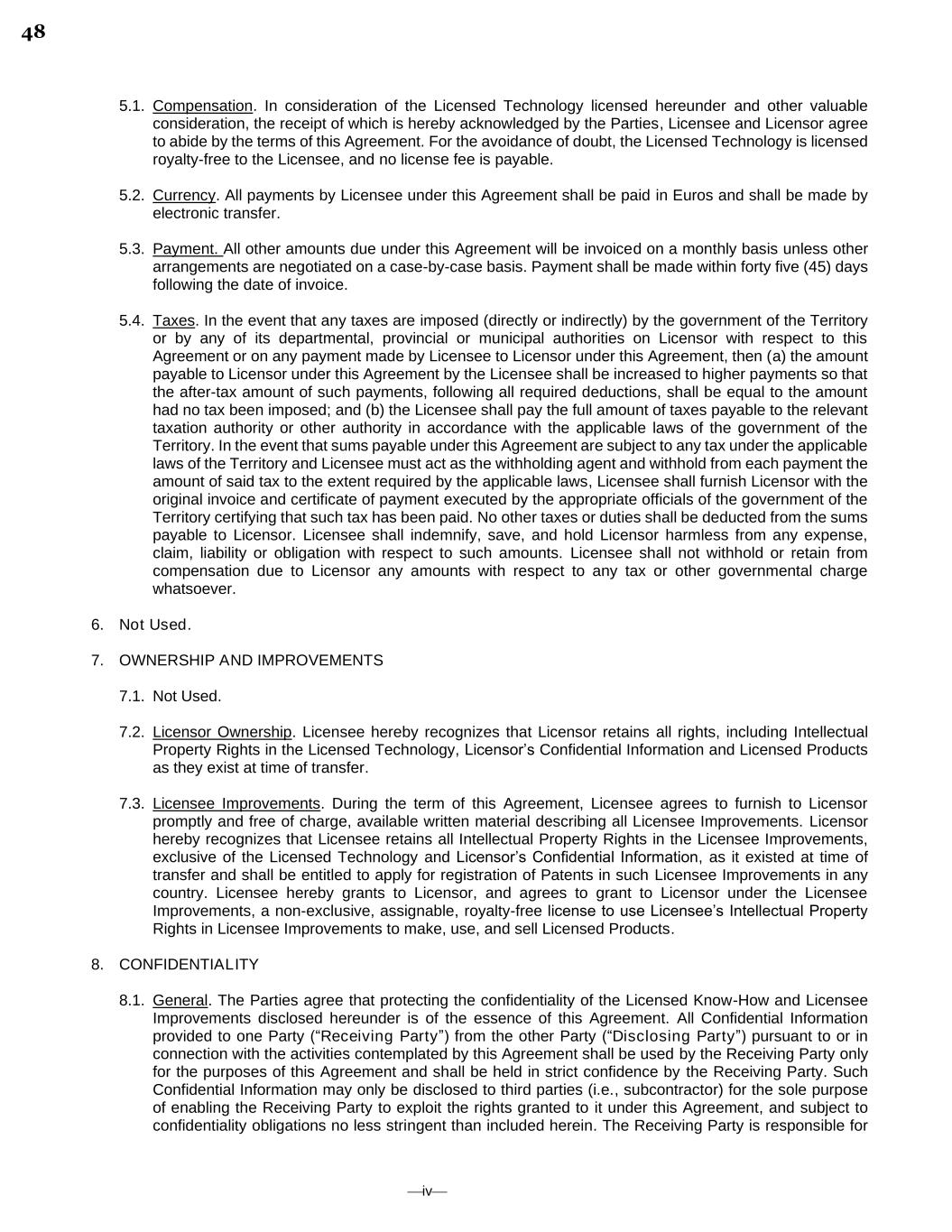⎯iv⎯ 5.1. Compensation. In consideration of the Licensed Technology licensed hereunder and other valuable consideration, the receipt of which is hereby acknowledged by the Parties, Licensee and Licensor agree to abide by the terms of this Agreement. For the avoidance of doubt, the Licensed Technology is licensed royalty-free to the Licensee, and no license fee is payable. 5.2. Currency. All payments by Licensee under this Agreement shall be paid in Euros and shall be made by electronic transfer. 5.3. Payment. All other amounts due under this Agreement will be invoiced on a monthly basis unless other arrangements are negotiated on a case-by-case basis. Payment shall be made within forty five (45) days following the date of invoice. 5.4. Taxes. In the event that any taxes are imposed (directly or indirectly) by the government of the Territory or by any of its departmental, provincial or municipal authorities on Licensor with respect to this Agreement or on any payment made by Licensee to Licensor under this Agreement, then (a) the amount payable to Licensor under this Agreement by the Licensee shall be increased to higher payments so that the after-tax amount of such payments, following all required deductions, shall be equal to the amount had no tax been imposed; and (b) the Licensee shall pay the full amount of taxes payable to the relevant taxation authority or other authority in accordance with the applicable laws of the government of the Territory. In the event that sums payable under this Agreement are subject to any tax under the applicable laws of the Territory and Licensee must act as the withholding agent and withhold from each payment the amount of said tax to the extent required by the applicable laws, Licensee shall furnish Licensor with the original invoice and certificate of payment executed by the appropriate officials of the government of the Territory certifying that such tax has been paid. No other taxes or duties shall be deducted from the sums payable to Licensor. Licensee shall indemnify, save, and hold Licensor harmless from any expense, claim, liability or obligation with respect to such amounts. Licensee shall not withhold or retain from compensation due to Licensor any amounts with respect to any tax or other governmental charge whatsoever. 6. Not Used. 7. OWNERSHIP AND IMPROVEMENTS 7.1. Not Used. 7.2. Licensor Ownership. Licensee hereby recognizes that Licensor retains all rights, including Intellectual Property Rights in the Licensed Technology, Licensor’s Confidential Information and Licensed Products as they exist at time of transfer. 7.3. Licensee Improvements. During the term of this Agreement, Licensee agrees to furnish to Licensor promptly and free of charge, available written material describing all Licensee Improvements. Licensor hereby recognizes that Licensee retains all Intellectual Property Rights in the Licensee Improvements, exclusive of the Licensed Technology and Licensor’s Confidential Information, as it existed at time of transfer and shall be entitled to apply for registration of Patents in such Licensee Improvements in any country. Licensee hereby grants to Licensor, and agrees to grant to Licensor under the Licensee Improvements, a non-exclusive, assignable, royalty-free license to use Licensee’s Intellectual Property Rights in Licensee Improvements to make, use, and sell Licensed Products. 8. CONFIDENTIALITY 8.1. General. The Parties agree that protecting the confidentiality of the Licensed Know-How and Licensee Improvements disclosed hereunder is of the essence of this Agreement. All Confidential Information provided to one Party (“Receiving Party”) from the other Party (“Disclosing Party”) pursuant to or in connection with the activities contemplated by this Agreement shall be used by the Receiving Party only for the purposes of this Agreement and shall be held in strict confidence by the Receiving Party. Such Confidential Information may only be disclosed to third parties (i.e., subcontractor) for the sole purpose of enabling the Receiving Party to exploit the rights granted to it under this Agreement, and subject to confidentiality obligations no less stringent than included herein. The Receiving Party is responsible for 48