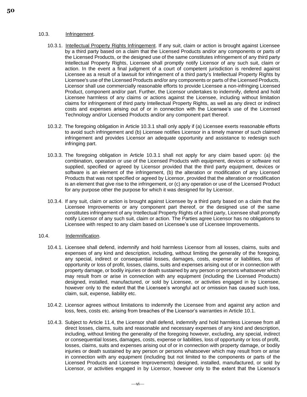 ⎯vi⎯ 10.3. Infringement. 10.3.1. Intellectual Property Rights Infringement. If any suit, claim or action is brought against Licensee by a third party based on a claim that the Licensed Products and/or any components or parts of the Licensed Products, or the designed use of the same constitutes infringement of any third party Intellectual Property Rights, Licensee shall promptly notify Licensor of any such suit, claim or action. In the event a final judgment of a court of competent jurisdiction is rendered against Licensee as a result of a lawsuit for infringement of a third party's Intellectual Property Rights by Licensee's use of the Licensed Products and/or any components or parts of the Licensed Products, Licensor shall use commercially reasonable efforts to provide Licensee a non-infringing Licensed Product, component and/or part. Further, the Licensor undertakes to indemnify, defend and hold Licensee harmless of any claims or actions against the Licensee, including without limitation claims for infringement of third party Intellectual Property Rights, as well as any direct or indirect costs and expenses arising out of or in connection with the Licensee’s use of the Licensed Technology and/or Licensed Products and/or any component part thereof. 10.3.2. The foregoing obligation in Article 10.3.1 shall only apply if (a) Licensee exerts reasonable efforts to avoid such infringement and (b) Licensee notifies Licensor in a timely manner of such claimed infringement and provides Licensor an adequate opportunity and assistance to redesign such infringing part. 10.3.3. The foregoing obligation in Article 10.3.1 shall not apply for any claim based upon: (a) the combination, operation or use of the Licensed Products with equipment, devices or software not supplied, specified or agreed by Licensor provided that the third party equipment, devices or software is an element of the infringement, (b) the alteration or modification of any Licensed Products that was not specified or agreed by Licensor, provided that the alteration or modification is an element that give rise to the infringement, or (c) any operation or use of the Licensed Product for any purpose other the purpose for which it was designed for by Licensor. 10.3.4. If any suit, claim or action is brought against Licensee by a third party based on a claim that the Licensee Improvements or any component part thereof, or the designed use of the same constitutes infringement of any Intellectual Property Rights of a third party, Licensee shall promptly notify Licensor of any such suit, claim or action. The Parties agree Licensor has no obligations to Licensee with respect to any claim based on Licensee’s use of Licensee Improvements. 10.4. Indemnification. 10.4.1. Licensee shall defend, indemnify and hold harmless Licensor from all losses, claims, suits and expenses of any kind and description, including, without limiting the generality of the foregoing, any special, indirect or consequential losses, damages, costs, expense or liabilities, loss of opportunity or loss of profit, losses, claims, suits and expenses arising out of or in connection with property damage, or bodily injuries or death sustained by any person or persons whatsoever which may result from or arise in connection with any equipment (including the Licensed Products) designed, installed, manufactured, or sold by Licensee, or activities engaged in by Licensee, however only to the extent that the Licensee’s wrongful act or omission has caused such loss, claim, suit, expense, liability etc. 10.4.2. Licensor agrees without limitations to indemnify the Licensee from and against any action and loss, fees, costs etc. arising from breaches of the Licensor’s warranties in Article 10.1. 10.4.3. Subject to Article 11.4, the Licensor shall defend, indemnify and hold harmless Licensee from all direct losses, claims, suits and reasonable and necessary expenses of any kind and description, including, without limiting the generality of the foregoing however, excluding, any special, indirect or consequential losses, damages, costs, expense or liabilities, loss of opportunity or loss of profit, losses, claims, suits and expenses arising out of or in connection with property damage, or bodily injuries or death sustained by any person or persons whatsoever which may result from or arise in connection with any equipment (including but not limited to the components or parts of the Licensed Products and Licensee Improvements) designed, installed, manufactured, or sold by Licensor, or activities engaged in by Licensor, however only to the extent that the Licensor’s 50