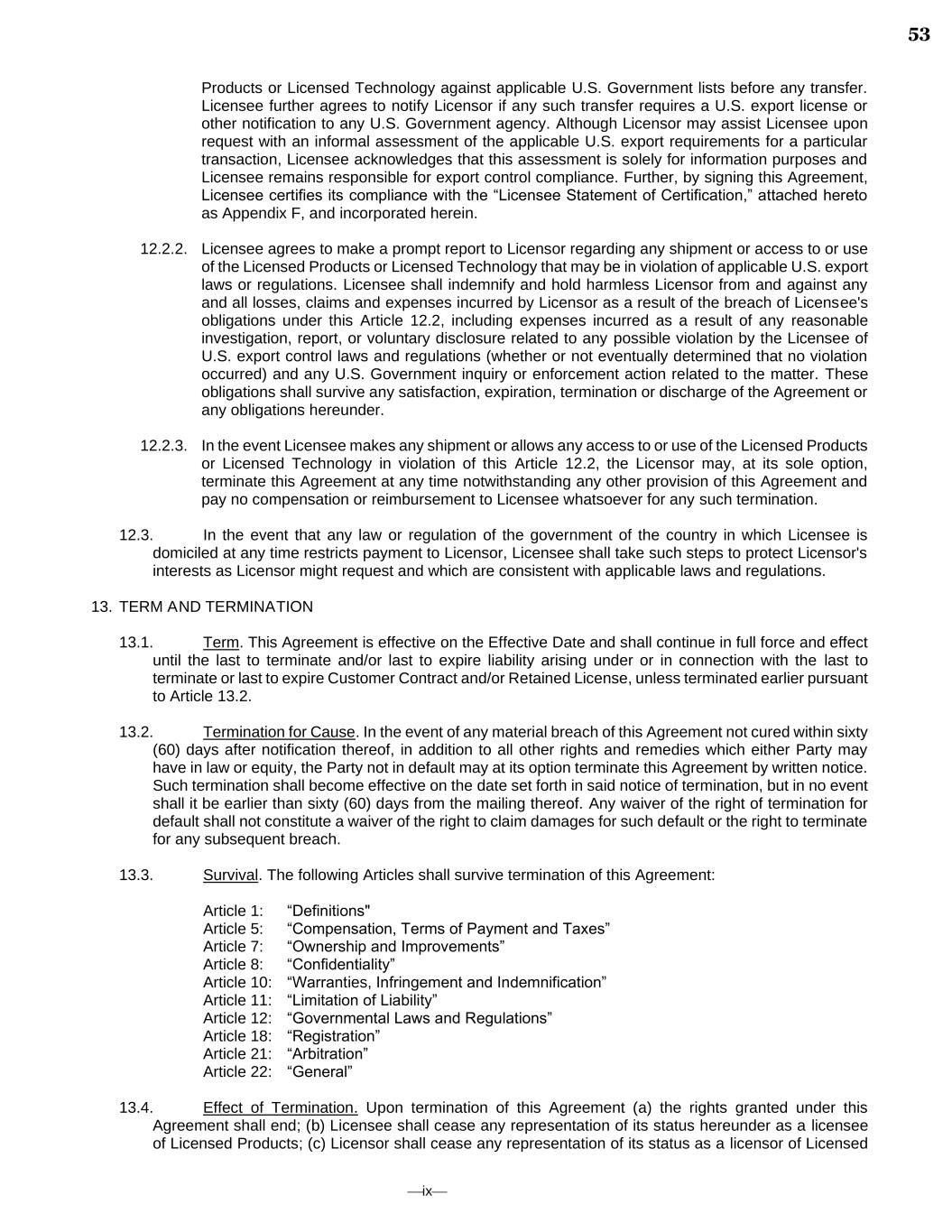 ⎯ix⎯ Products or Licensed Technology against applicable U.S. Government lists before any transfer. Licensee further agrees to notify Licensor if any such transfer requires a U.S. export license or other notification to any U.S. Government agency. Although Licensor may assist Licensee upon request with an informal assessment of the applicable U.S. export requirements for a particular transaction, Licensee acknowledges that this assessment is solely for information purposes and Licensee remains responsible for export control compliance. Further, by signing this Agreement, Licensee certifies its compliance with the “Licensee Statement of Certification,” attached hereto as Appendix F, and incorporated herein. 12.2.2. Licensee agrees to make a prompt report to Licensor regarding any shipment or access to or use of the Licensed Products or Licensed Technology that may be in violation of applicable U.S. export laws or regulations. Licensee shall indemnify and hold harmless Licensor from and against any and all losses, claims and expenses incurred by Licensor as a result of the breach of Licensee's obligations under this Article 12.2, including expenses incurred as a result of any reasonable investigation, report, or voluntary disclosure related to any possible violation by the Licensee of U.S. export control laws and regulations (whether or not eventually determined that no violation occurred) and any U.S. Government inquiry or enforcement action related to the matter. These obligations shall survive any satisfaction, expiration, termination or discharge of the Agreement or any obligations hereunder. 12.2.3. In the event Licensee makes any shipment or allows any access to or use of the Licensed Products or Licensed Technology in violation of this Article 12.2, the Licensor may, at its sole option, terminate this Agreement at any time notwithstanding any other provision of this Agreement and pay no compensation or reimbursement to Licensee whatsoever for any such termination. 12.3. In the event that any law or regulation of the government of the country in which Licensee is domiciled at any time restricts payment to Licensor, Licensee shall take such steps to protect Licensor's interests as Licensor might request and which are consistent with applicable laws and regulations. 13. TERM AND TERMINATION 13.1. Term. This Agreement is effective on the Effective Date and shall continue in full force and effect until the last to terminate and/or last to expire liability arising under or in connection with the last to terminate or last to expire Customer Contract and/or Retained License, unless terminated earlier pursuant to Article 13.2. 13.2. Termination for Cause. In the event of any material breach of this Agreement not cured within sixty (60) days after notification thereof, in addition to all other rights and remedies which either Party may have in law or equity, the Party not in default may at its option terminate this Agreement by written notice. Such termination shall become effective on the date set forth in said notice of termination, but in no event shall it be earlier than sixty (60) days from the mailing thereof. Any waiver of the right of termination for default shall not constitute a waiver of the right to claim damages for such default or the right to terminate for any subsequent breach. 13.3. Survival. The following Articles shall survive termination of this Agreement: Article 1: “Definitions" Article 5: “Compensation, Terms of Payment and Taxes” Article 7: “Ownership and Improvements” Article 8: “Confidentiality” Article 10: “Warranties, Infringement and Indemnification” Article 11: “Limitation of Liability” Article 12: “Governmental Laws and Regulations” Article 18: “Registration” Article 21: “Arbitration” Article 22: “General” 13.4. Effect of Termination. Upon termination of this Agreement (a) the rights granted under this Agreement shall end; (b) Licensee shall cease any representation of its status hereunder as a licensee of Licensed Products; (c) Licensor shall cease any representation of its status as a licensor of Licensed 53