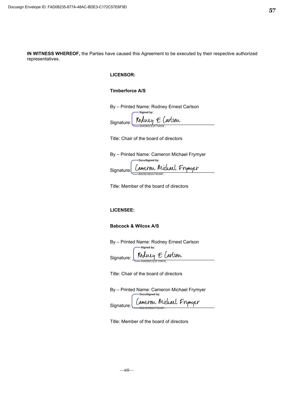 ⎯xiii⎯ IN WITNESS WHEREOF, the Parties have caused this Agreement to be executed by their respective authorized representatives. LICENSOR: Timberforce A/S By – Printed Name: Rodney Ernest Carlson Signature: ________________________________ Title: Chair of the board of directors By – Printed Name: Cameron Michael Frymyer Signature: ________________________________ Title: Member of the board of directors LICENSEE: Babcock & Wilcox A/S By – Printed Name: Rodney Ernest Carlson Signature: ________________________________ Title: Chair of the board of directors By – Printed Name: Cameron Michael Frymyer Signature: ________________________________ Title: Member of the board of directors Docusign Envelope ID: FAD08235-877A-48AC-BDE3-C172C57E6F9D 57
