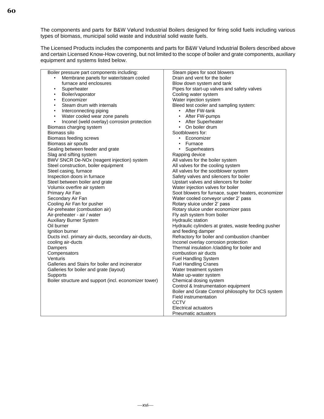 ⎯xvi⎯ The components and parts for B&W Vølund Industrial Boilers designed for firing solid fuels including various types of biomass, municipal solid waste and industrial solid waste fuels. The Licensed Products includes the components and parts for B&W Vølund Industrial Boilers described above and certain Licensed Know-How covering, but not limited to the scope of boiler and grate components, auxiliary equipment and systems listed below. Boiler pressure part components including: • Membrane panels for water/steam cooled furnace and enclosures • Superheater • Boiler/vaporator • Economizer • Steam drum with internals • Interconnecting piping • Water cooled wear zone panels • Inconel (weld overlay) corrosion protection Biomass charging system Biomass silo Biomass feeding screws Biomass air spouts Sealing between feeder and grate Slag and sifting system BWV SNCR De-NOx (reagent injection) system Steel construction, boiler equipment Steel casing, furnace Inspection doors in furnace Steel between boiler and grate Volumix overfire air system Primary Air Fan Secondary Air Fan Cooling Air Fan for pusher Air-preheater (combustion air) Air-preheater - air / water Auxiliary Burner System Oil burner Ignition burner Ducts incl. primary air-ducts, secondary air-ducts, cooling air-ducts Dampers Compensators Venturis Galleries and Stairs for boiler and incinerator Galleries for boiler and grate (layout) Supports Boiler structure and support (incl. economizer tower) Steam pipes for soot blowers Drain and vent for the boiler Blow down system and tank Pipes for start-up valves and safety valves Cooling water system Water injection system Bleed test cooler and sampling system: • After FW-tank • After FW-pumps • After Superheater • On boiler drum Sootblowers for: • Economizer • Furnace • Superheaters Rapping device All valves for the boiler system All valves for the cooling system All valves for the sootblower system Safety valves and silencers for boiler Upstart valves and silencers for boiler Water injection valves for boiler Soot blowers for furnace, super heaters, economizer Water cooled conveyor under 2’ pass Rotary sluice under 2’ pass Rotary sluice under economizer pass Fly ash system from boiler Hydraulic station Hydraulic cylinders at grates, waste feeding pusher and feeding damper Refractory for boiler and combustion chamber Inconel overlay corrosion protection Thermal insulation /cladding for boiler and combustion air ducts Fuel Handling System Fuel Handling Cranes Water treatment system Make up-water system Chemical dosing system Control & Instrumentation equipment Boiler and Grate Control philosophy for DCS system Field instrumentation CCTV Electrical actuators Pneumatic actuators 60