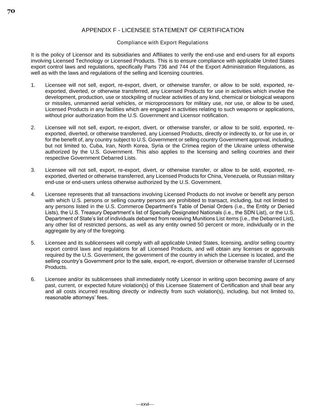 ⎯xxvi⎯ APPENDIX F - LICENSEE STATEMENT OF CERTIFICATION Compliance with Export Regulations It is the policy of Licensor and its subsidiaries and Affiliates to verify the end-use and end-users for all exports involving Licensed Technology or Licensed Products. This is to ensure compliance with applicable United States export control laws and regulations, specifically Parts 736 and 744 of the Export Administration Regulations, as well as with the laws and regulations of the selling and licensing countries. 1. Licensee will not sell, export, re-export, divert, or otherwise transfer, or allow to be sold, exported, re- exported, diverted, or otherwise transferred, any Licensed Products for use in activities which involve the development, production, use or stockpiling of nuclear activities of any kind, chemical or biological weapons or missiles, unmanned aerial vehicles, or microprocessors for military use, nor use, or allow to be used, Licensed Products in any facilities which are engaged in activities relating to such weapons or applications, without prior authorization from the U.S. Government and Licensor notification. 2. Licensee will not sell, export, re-export, divert, or otherwise transfer, or allow to be sold, exported, re- exported, diverted, or otherwise transferred, any Licensed Products, directly or indirectly to, or for use in, or for the benefit of, any country subject to U.S. Government or selling country Government approval, including, but not limited to, Cuba, Iran, North Korea, Syria or the Crimea region of the Ukraine unless otherwise authorized by the U.S. Government. This also applies to the licensing and selling countries and their respective Government Debarred Lists. 3. Licensee will not sell, export, re-export, divert, or otherwise transfer, or allow to be sold, exported, re- exported, diverted or otherwise transferred, any Licensed Products for China, Venezuela, or Russian military end-use or end-users unless otherwise authorized by the U.S. Government. 4. Licensee represents that all transactions involving Licensed Products do not involve or benefit any person with which U.S. persons or selling country persons are prohibited to transact, including, but not limited to any persons listed in the U.S. Commerce Department’s Table of Denial Orders (i.e., the Entity or Denied Lists), the U.S. Treasury Department’s list of Specially Designated Nationals (i.e., the SDN List), or the U.S. Department of State’s list of individuals debarred from receiving Munitions List items (i.e., the Debarred List), any other list of restricted persons, as well as any entity owned 50 percent or more, individually or in the aggregate by any of the foregoing. 5. Licensee and its sublicensees will comply with all applicable United States, licensing, and/or selling country export control laws and regulations for all Licensed Products, and will obtain any licenses or approvals required by the U.S. Government, the government of the country in which the Licensee is located, and the selling country’s Government prior to the sale, export, re-export, diversion or otherwise transfer of Licensed Products. 6. Licensee and/or its sublicensees shall immediately notify Licensor in writing upon becoming aware of any past, current, or expected future violation(s) of this Licensee Statement of Certification and shall bear any and all costs incurred resulting directly or indirectly from such violation(s), including, but not limited to, reasonable attorneys’ fees. 70