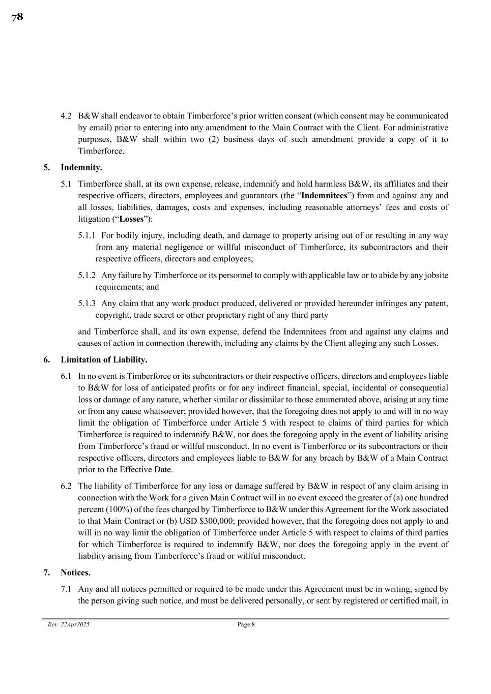 Rev. 22Apr2025 Page 8 4.2 B&W shall endeavor to obtain Timberforce’s prior written consent (which consent may be communicated by email) prior to entering into any amendment to the Main Contract with the Client. For administrative purposes, B&W shall within two (2) business days of such amendment provide a copy of it to Timberforce. 5. Indemnity. 5.1 Timberforce shall, at its own expense, release, indemnify and hold harmless B&W, its affiliates and their respective officers, directors, employees and guarantors (the “Indemnitees”) from and against any and all losses, liabilities, damages, costs and expenses, including reasonable attorneys’ fees and costs of litigation (“Losses”): 5.1.1 For bodily injury, including death, and damage to property arising out of or resulting in any way from any material negligence or willful misconduct of Timberforce, its subcontractors and their respective officers, directors and employees; 5.1.2 Any failure by Timberforce or its personnel to comply with applicable law or to abide by any jobsite requirements; and 5.1.3 Any claim that any work product produced, delivered or provided hereunder infringes any patent, copyright, trade secret or other proprietary right of any third party and Timberforce shall, and its own expense, defend the Indemnitees from and against any claims and causes of action in connection therewith, including any claims by the Client alleging any such Losses. 6. Limitation of Liability. 6.1 In no event is Timberforce or its subcontractors or their respective officers, directors and employees liable to B&W for loss of anticipated profits or for any indirect financial, special, incidental or consequential loss or damage of any nature, whether similar or dissimilar to those enumerated above, arising at any time or from any cause whatsoever; provided however, that the foregoing does not apply to and will in no way limit the obligation of Timberforce under Article 5 with respect to claims of third parties for which Timberforce is required to indemnify B&W, nor does the foregoing apply in the event of liability arising from Timberforce’s fraud or willful misconduct. In no event is Timberforce or its subcontractors or their respective officers, directors and employees liable to B&W for any breach by B&W of a Main Contract prior to the Effective Date. 6.2 The liability of Timberforce for any loss or damage suffered by B&W in respect of any claim arising in connection with the Work for a given Main Contract will in no event exceed the greater of (a) one hundred percent (100%) of the fees charged by Timberforce to B&W under this Agreement for the Work associated to that Main Contract or (b) USD $300,000; provided however, that the foregoing does not apply to and will in no way limit the obligation of Timberforce under Article 5 with respect to claims of third parties for which Timberforce is required to indemnify B&W, nor does the foregoing apply in the event of liability arising from Timberforce’s fraud or willful misconduct. 7. Notices. 7.1 Any and all notices permitted or required to be made under this Agreement must be in writing, signed by the person giving such notice, and must be delivered personally, or sent by registered or certified mail, in 78