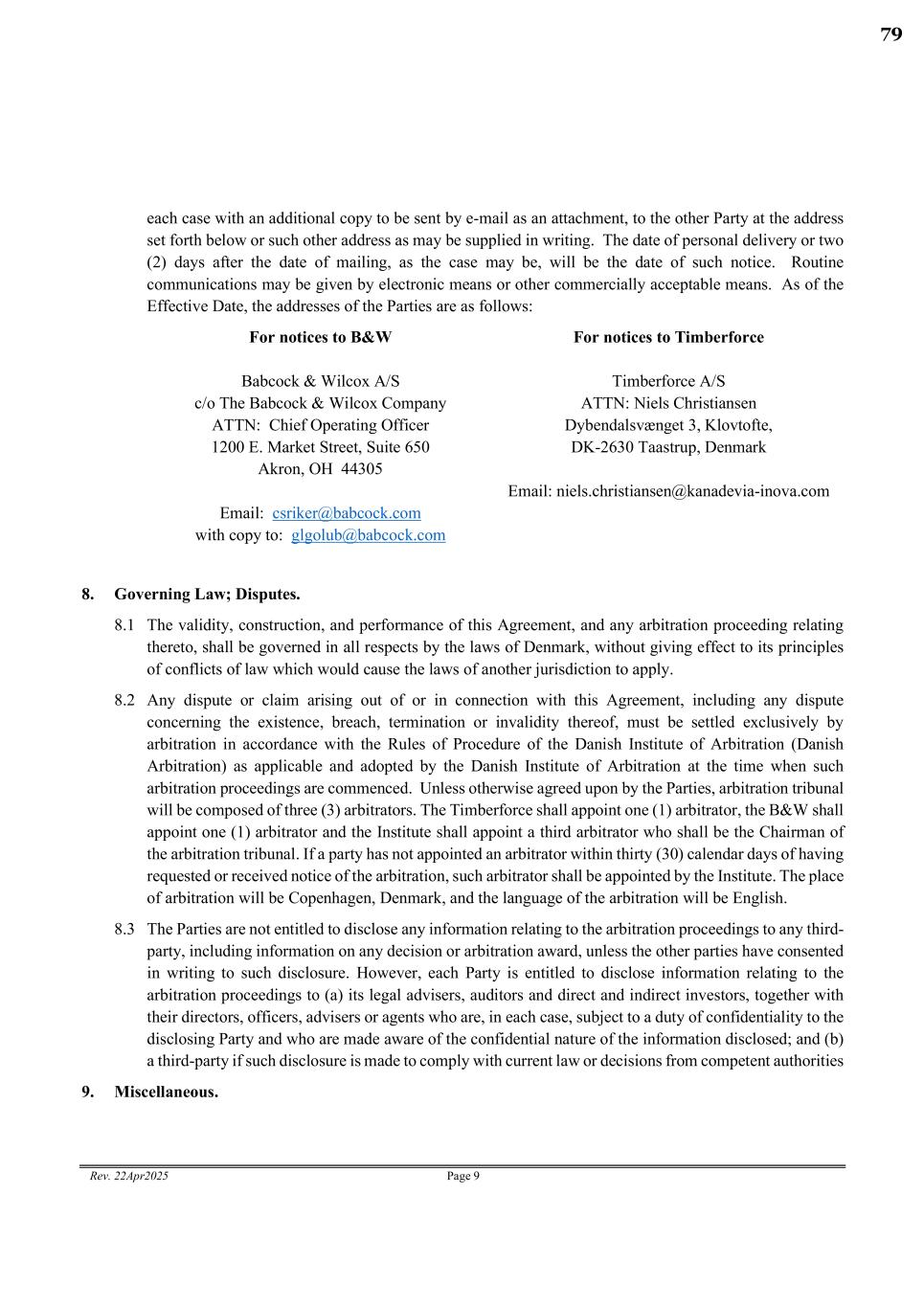 Rev. 22Apr2025 Page 9 each case with an additional copy to be sent by e-mail as an attachment, to the other Party at the address set forth below or such other address as may be supplied in writing. The date of personal delivery or two (2) days after the date of mailing, as the case may be, will be the date of such notice. Routine communications may be given by electronic means or other commercially acceptable means. As of the Effective Date, the addresses of the Parties are as follows: For notices to B&W For notices to Timberforce Babcock & Wilcox A/S c/o The Babcock & Wilcox Company ATTN: Chief Operating Officer 1200 E. Market Street, Suite 650 Akron, OH 44305 Email: csriker@babcock.com with copy to: glgolub@babcock.com Timberforce A/S ATTN: Niels Christiansen Dybendalsvænget 3, Klovtofte, DK-2630 Taastrup, Denmark Email: niels.christiansen@kanadevia-inova.com 8. Governing Law; Disputes. 8.1 The validity, construction, and performance of this Agreement, and any arbitration proceeding relating thereto, shall be governed in all respects by the laws of Denmark, without giving effect to its principles of conflicts of law which would cause the laws of another jurisdiction to apply. 8.2 Any dispute or claim arising out of or in connection with this Agreement, including any dispute concerning the existence, breach, termination or invalidity thereof, must be settled exclusively by arbitration in accordance with the Rules of Procedure of the Danish Institute of Arbitration (Danish Arbitration) as applicable and adopted by the Danish Institute of Arbitration at the time when such arbitration proceedings are commenced. Unless otherwise agreed upon by the Parties, arbitration tribunal will be composed of three (3) arbitrators. The Timberforce shall appoint one (1) arbitrator, the B&W shall appoint one (1) arbitrator and the Institute shall appoint a third arbitrator who shall be the Chairman of the arbitration tribunal. If a party has not appointed an arbitrator within thirty (30) calendar days of having requested or received notice of the arbitration, such arbitrator shall be appointed by the Institute. The place of arbitration will be Copenhagen, Denmark, and the language of the arbitration will be English. 8.3 The Parties are not entitled to disclose any information relating to the arbitration proceedings to any third- party, including information on any decision or arbitration award, unless the other parties have consented in writing to such disclosure. However, each Party is entitled to disclose information relating to the arbitration proceedings to (a) its legal advisers, auditors and direct and indirect investors, together with their directors, officers, advisers or agents who are, in each case, subject to a duty of confidentiality to the disclosing Party and who are made aware of the confidential nature of the information disclosed; and (b) a third-party if such disclosure is made to comply with current law or decisions from competent authorities 9. Miscellaneous. 79
