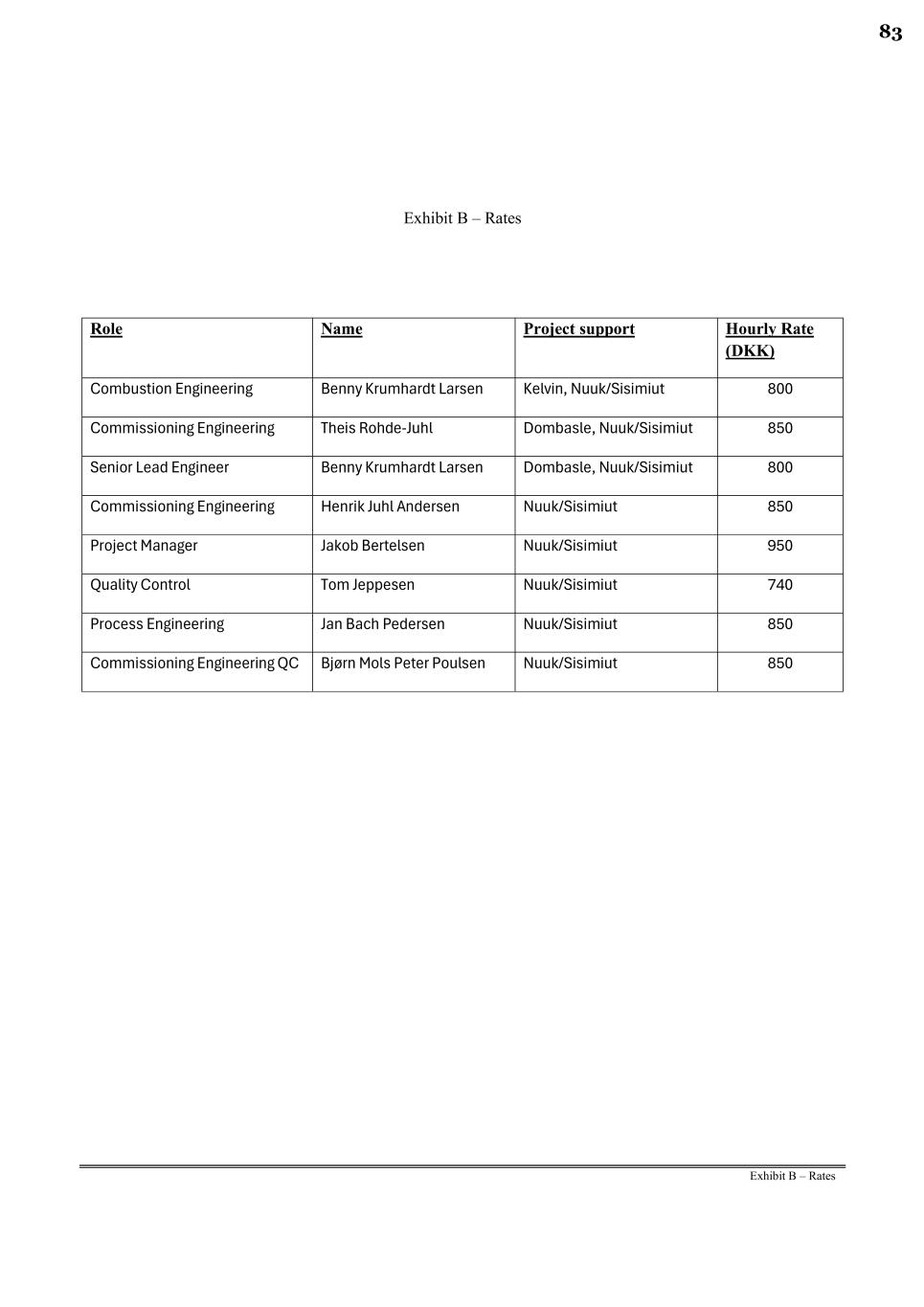 Exhibit B – Rates Exhibit B – Rates Role Name Project support Hourly Rate (DKK) Combustion Engineering Benny Krumhardt Larsen Kelvin, Nuuk/Sisimiut 800 Commissioning Engineering Theis Rohde-Juhl Dombasle, Nuuk/Sisimiut 850 Senior Lead Engineer Benny Krumhardt Larsen Dombasle, Nuuk/Sisimiut 800 Commissioning Engineering Henrik Juhl Andersen Nuuk/Sisimiut 850 Project Manager Jakob Bertelsen Nuuk/Sisimiut 950 Quality Control Tom Jeppesen Nuuk/Sisimiut 740 Process Engineering Jan Bach Pedersen Nuuk/Sisimiut 850 Commissioning Engineering QC Bjørn Mols Peter Poulsen Nuuk/Sisimiut 850 83