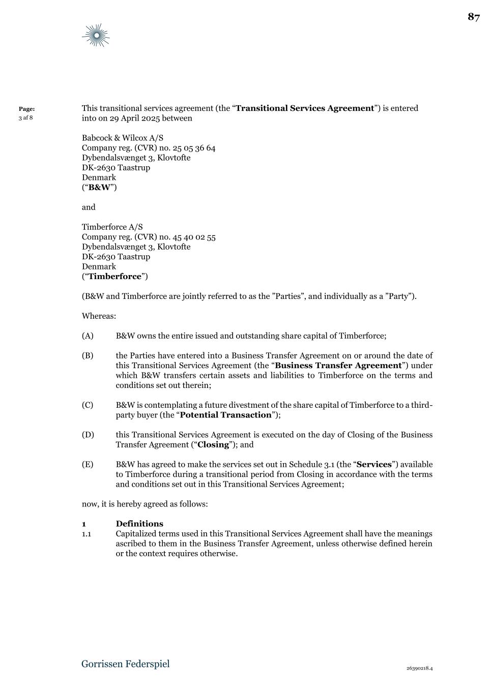 26390218.4 Page: 3 af 8 This transitional services agreement (the “Transitional Services Agreement”) is entered into on 29 April 2025 between Babcock & Wilcox A/S Company reg. (CVR) no. 25 05 36 64 Dybendalsvænget 3, Klovtofte DK-2630 Taastrup Denmark (“B&W”) and Timberforce A/S Company reg. (CVR) no. 45 40 02 55 Dybendalsvænget 3, Klovtofte DK-2630 Taastrup Denmark (“Timberforce”) (B&W and Timberforce are jointly referred to as the ”Parties”, and individually as a ”Party”). Whereas: (A) B&W owns the entire issued and outstanding share capital of Timberforce; (B) the Parties have entered into a Business Transfer Agreement on or around the date of this Transitional Services Agreement (the “Business Transfer Agreement”) under which B&W transfers certain assets and liabilities to Timberforce on the terms and conditions set out therein; (C) B&W is contemplating a future divestment of the share capital of Timberforce to a third- party buyer (the “Potential Transaction”); (D) this Transitional Services Agreement is executed on the day of Closing of the Business Transfer Agreement (“Closing”); and (E) B&W has agreed to make the services set out in Schedule 3.1 (the “Services”) available to Timberforce during a transitional period from Closing in accordance with the terms and conditions set out in this Transitional Services Agreement; now, it is hereby agreed as follows: 1 Definitions 1.1 Capitalized terms used in this Transitional Services Agreement shall have the meanings ascribed to them in the Business Transfer Agreement, unless otherwise defined herein or the context requires otherwise. 87