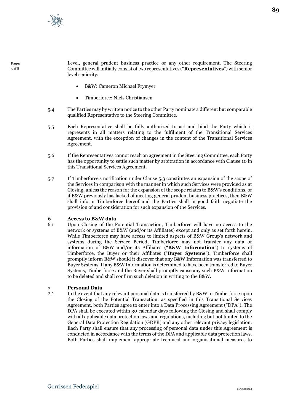 26390218.4 Page: 5 af 8 Level, general prudent business practice or any other requirement. The Steering Committee will initially consist of two representatives (“Representatives”) with senior level seniority: • B&W: Cameron Michael Frymyer • Timberforce: Niels Christiansen 5.4 The Parties may by written notice to the other Party nominate a different but comparable qualified Representative to the Steering Committee. 5.5 Each Representative shall be fully authorized to act and bind the Party which it represents in all matters relating to the fulfilment of the Transitional Services Agreement, with the exception of changes in the content of the Transitional Services Agreement. 5.6 If the Representatives cannot reach an agreement in the Steering Committee, each Party has the opportunity to settle such matter by arbitration in accordance with Clause 10 in this Transitional Services Agreement. 5.7 If Timberforce’s notification under Clause 5.3 constitutes an expansion of the scope of the Services in comparison with the manner in which such Services were provided as at Closing, unless the reason for the expansion of the scope relates to B&W’s conditions, or if B&W previously has lacked of meeting general prudent business practices, then B&W shall inform Timberforce hereof and the Parties shall in good faith negotiate the provision of and consideration for such expansion of the Services. 6 Access to B&W data 6.1 Upon Closing of the Potential Transaction, Timberforce will have no access to the network or systems of B&W (and/or its Affiliates) except and only as set forth herein. While Timberforce may have access to limited aspects of B&W Group’s network and systems during the Service Period, Timberforce may not transfer any data or information of B&W and/or its Affiliates (“B&W Information”) to systems of Timberforce, the Buyer or their Affiliates (“Buyer Systems”). Timberforce shall promptly inform B&W should it discover that any B&W Information was transferred to Buyer Systems. If any B&W Information is determined to have been transferred to Buyer Systems, Timberforce and the Buyer shall promptly cause any such B&W Information to be deleted and shall confirm such deletion in writing to the B&W. 7 Personal Data 7.1 In the event that any relevant personal data is transferred by B&W to Timberforce upon the Closing of the Potential Transaction, as specified in this Transitional Services Agreement, both Parties agree to enter into a Data Processing Agreement ("DPA"). The DPA shall be executed within 30 calendar days following the Closing and shall comply with all applicable data protection laws and regulations, including but not limited to the General Data Protection Regulation (GDPR) and any other relevant privacy legislation. Each Party shall ensure that any processing of personal data under this Agreement is conducted in accordance with the terms of the DPA and applicable data protection laws. Both Parties shall implement appropriate technical and organisational measures to 89