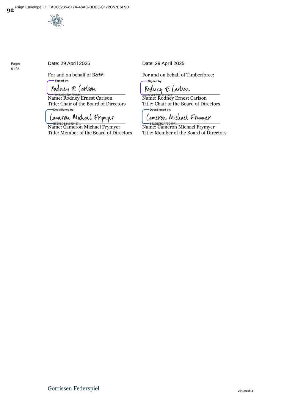 Docusign Envelope ID: FAD08235-877A-48AC-BDE3-C172C57E6F9D Date: 29 April 2025 Date: 29 April 2025Page: 8 af 8 For and on behalf of B&W: For and on behalf of Timberforce: Title: Chair of the Board of Directors Name: Rodney Ernest Carlson _________________________ _________________________ Name: Rodney Ernest Carlson Title: Chair of the Board of Directors Title: Member of the Board of Directors Name: Cameron Michael Frymyer _________________________ _________________________ Name: Cameron Michael Frymyer Title: Member of the Board of Directors 26390218.4 92